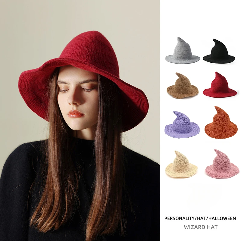 Cappello di Halloween vintage in lana lavorata a maglia da donna, cappello da strega per travestimenti, cappello da maschera per feste, accessori decorativi per le festività