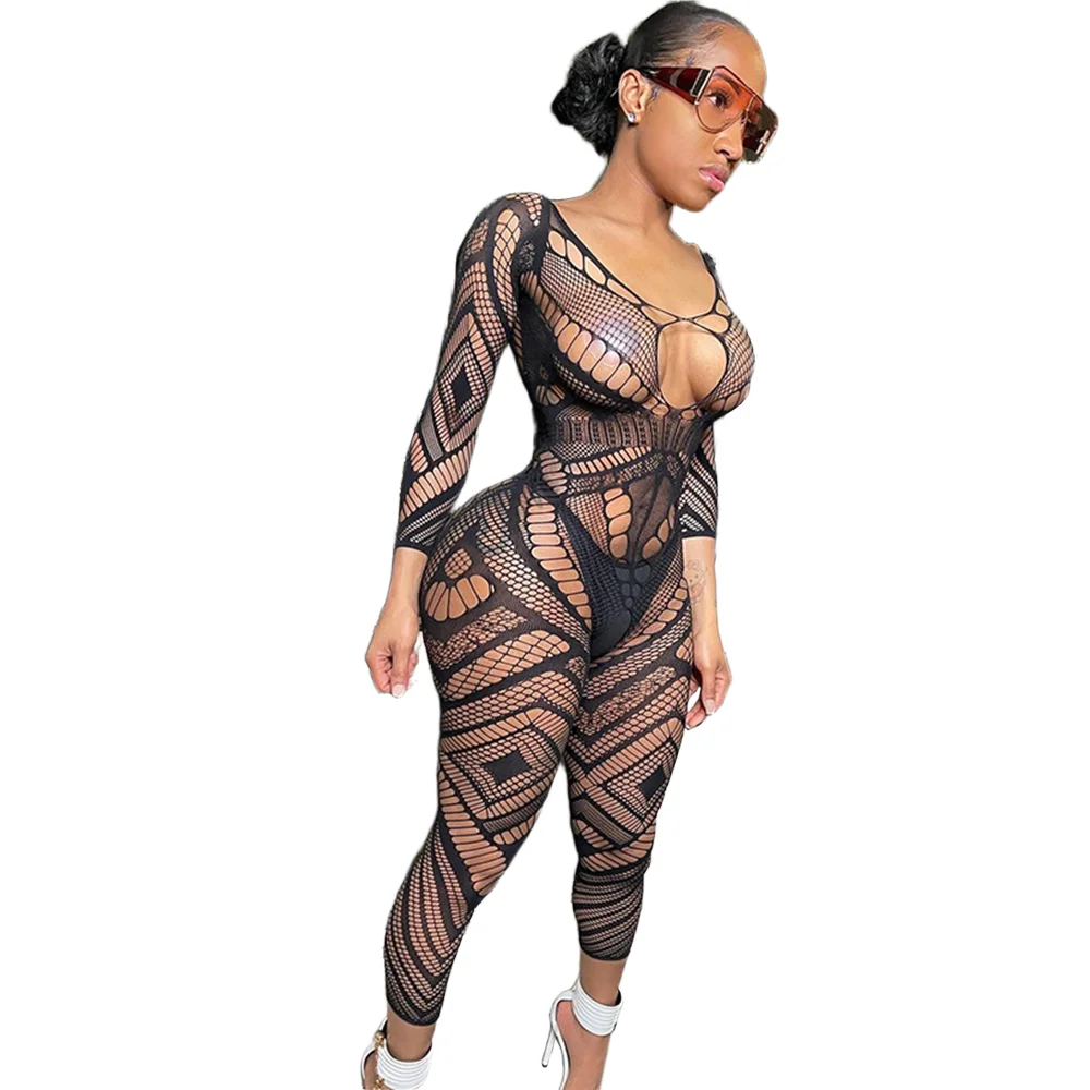 Sibybo Mesh Splicing tuta donna Sexys asimmetrico Hollow manica lunga Damen tute Street Style aderente Casual One Peices