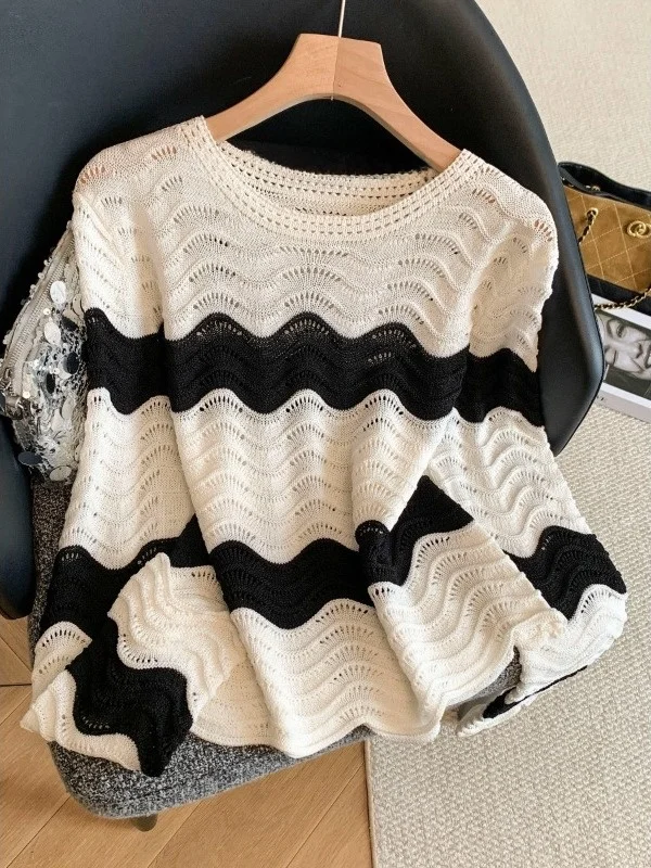 Top da donna in maglia sottile traforata, con spalle larghe, stile coreano, alla moda primaverile, dal design raffinato.