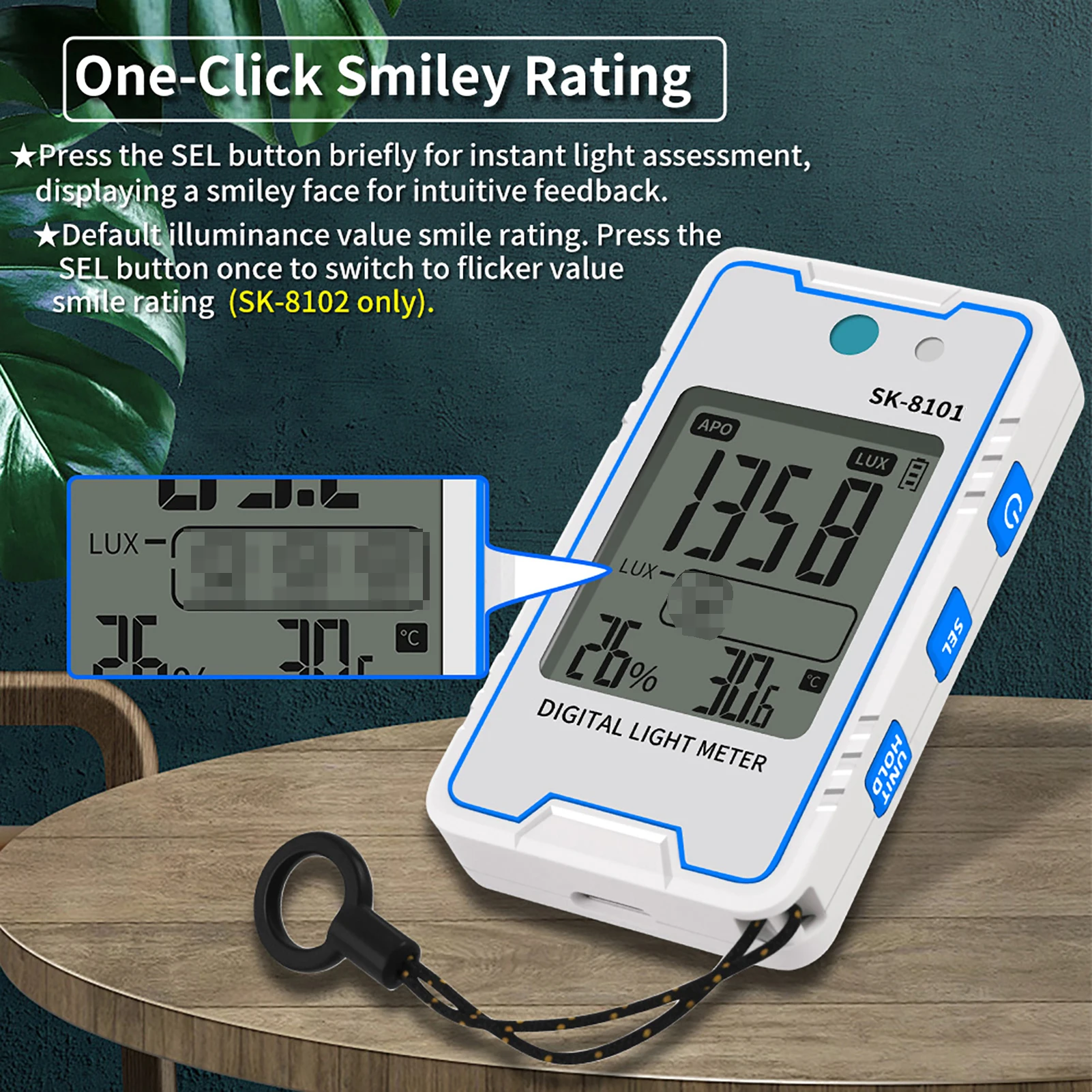 Mini Luxmetro Digitale con Display Temperatura e Umidità, Spegnimento Automatico, Mantenimento Dati, Conversione Unità FC, 0.1-99990 Lux