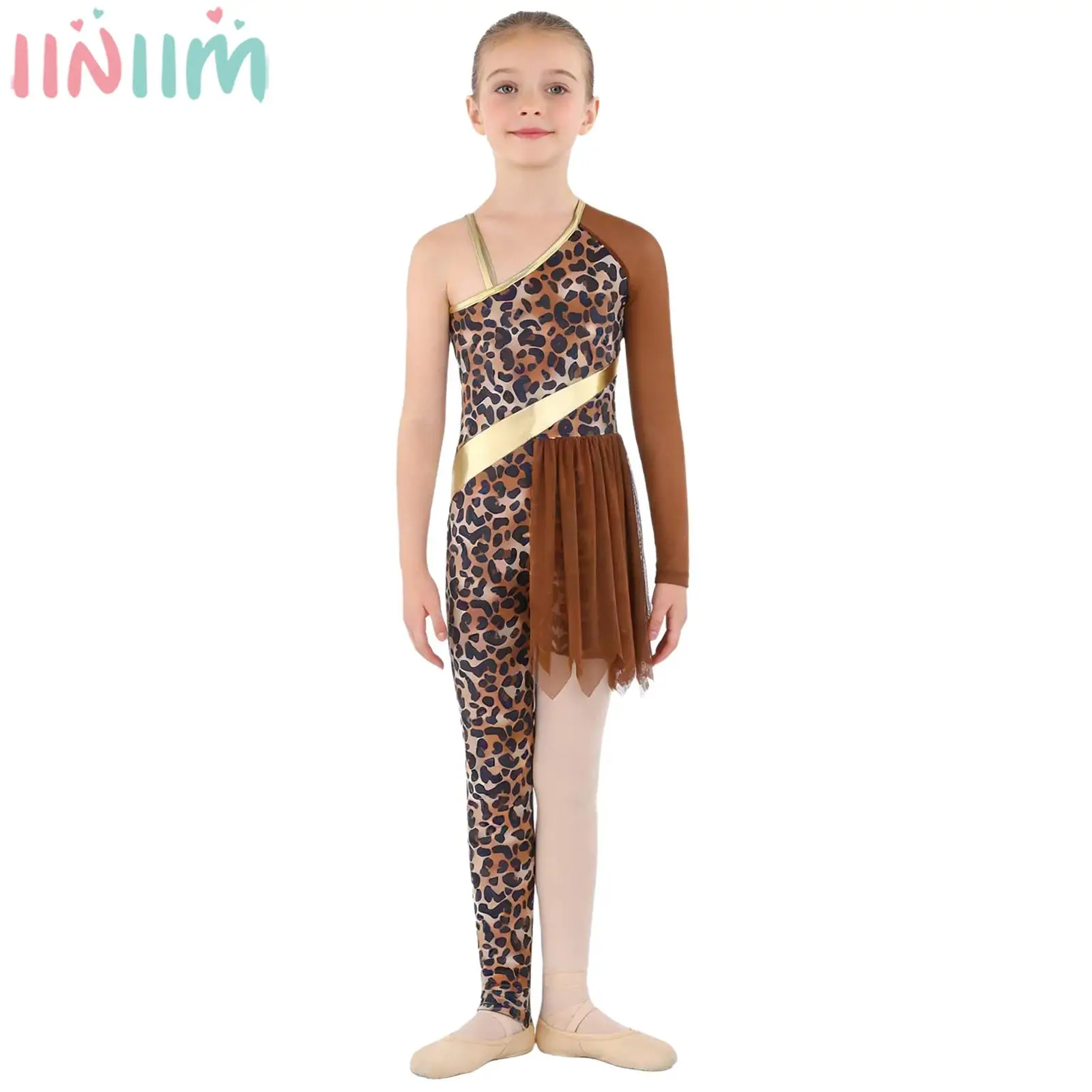 Bambini Ragazze Halloween Cavegirl Primitive Tribe Costume Cosplay Una spalla Leopardo Caveman Tuta Ginnastica Body da ballo