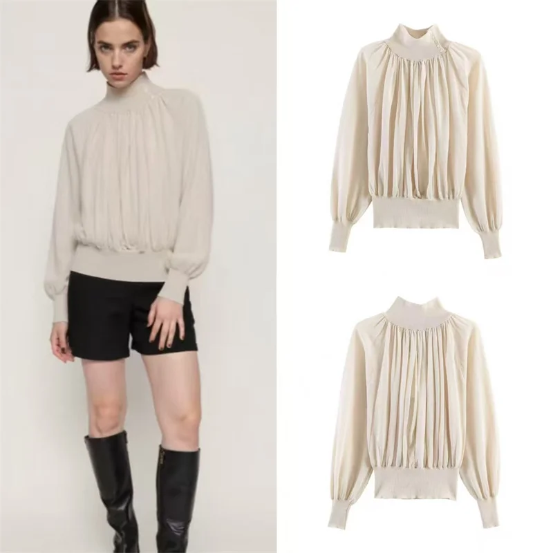 Camicia da Donna in Maglia con Inserti Drappeggiati, Manica Lunga, Scollo a V, Vestibilità Slim, Casual, con Bottoni, Disponibile in Nero, Bianco e Kaki