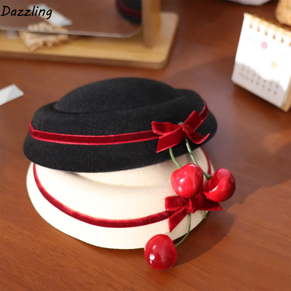 Fermaglio per Capelli con Fiocco in Velluto e Ciliegia, Stile Francese, Accessorio per Capelli da Donna per Feste