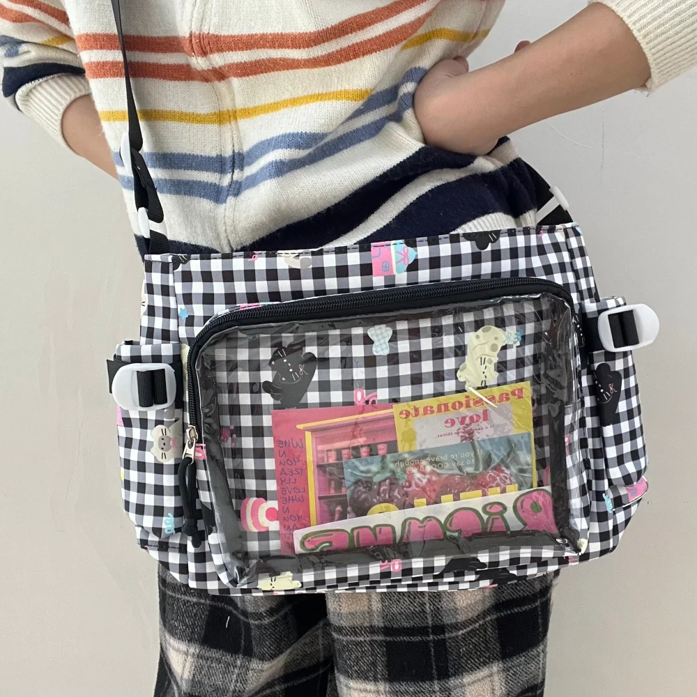 Borsa a tracolla casual da donna Richme 2026, chic per studentesse, borsa a tracolla grande spazio per laptop da 14 pollici, in nylon a quadri con cartoni animati, Bolsos Mujer