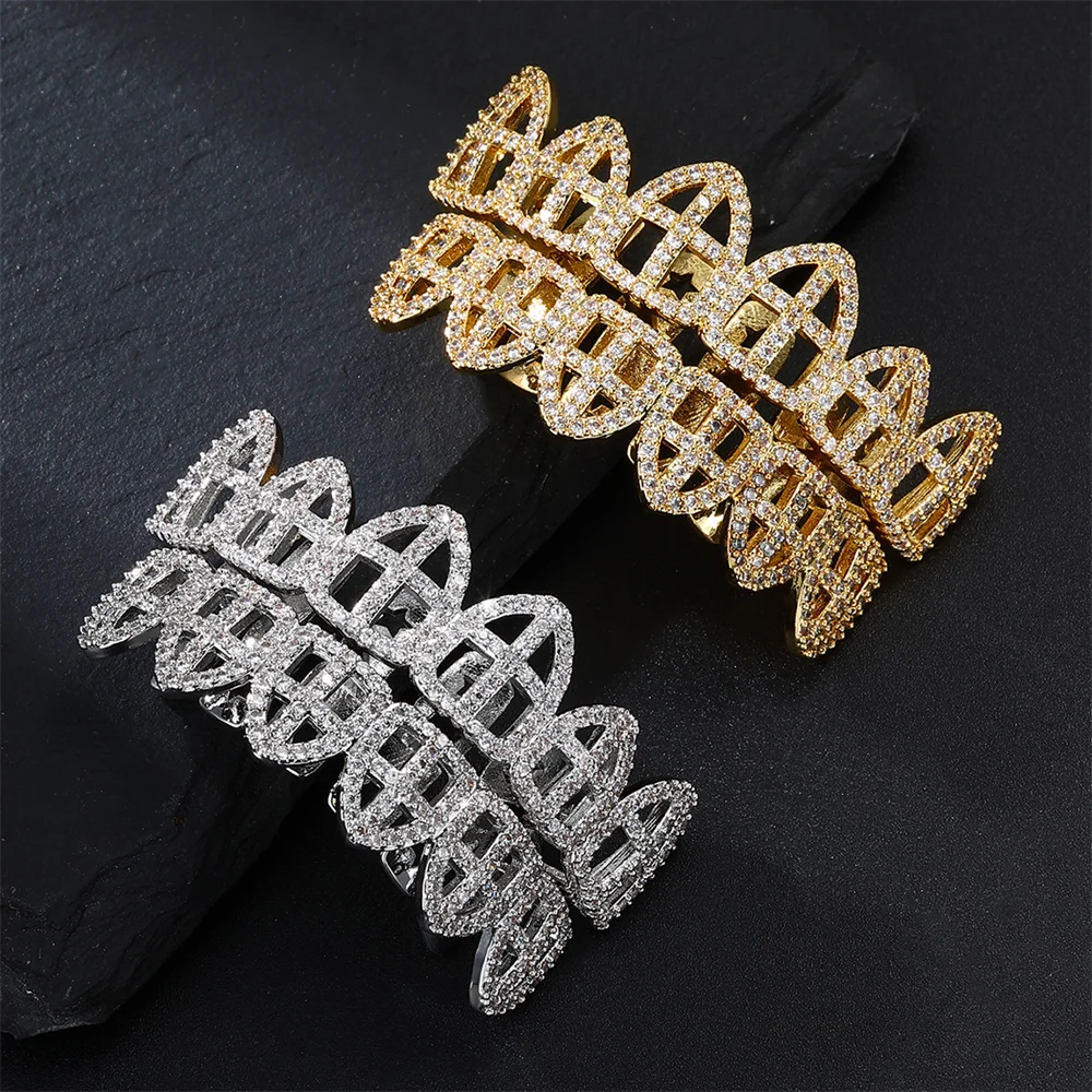 HipHop Denti ghiacciati Grillz Set per uomo Donna Bling Zircone cubico Pavimentato Griglie superiori e inferiori Tappi per denti Gioielli per feste placcati in oro