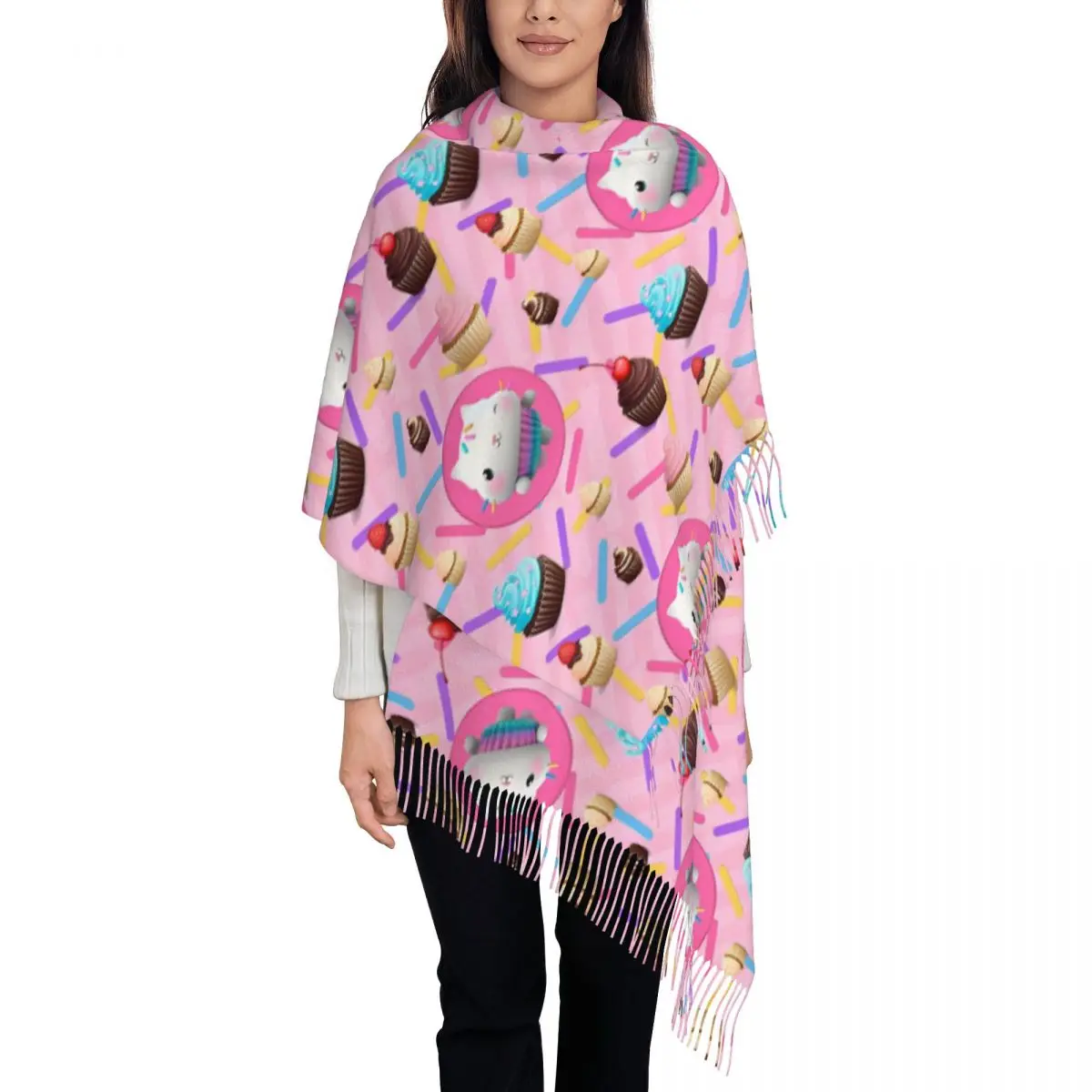 Sciarpa per casa delle bambole Gabby con gatto carino per donna Sciarpe lunghe avvolgenti con scialle caldo invernale con nappa per l'uso quotidiano