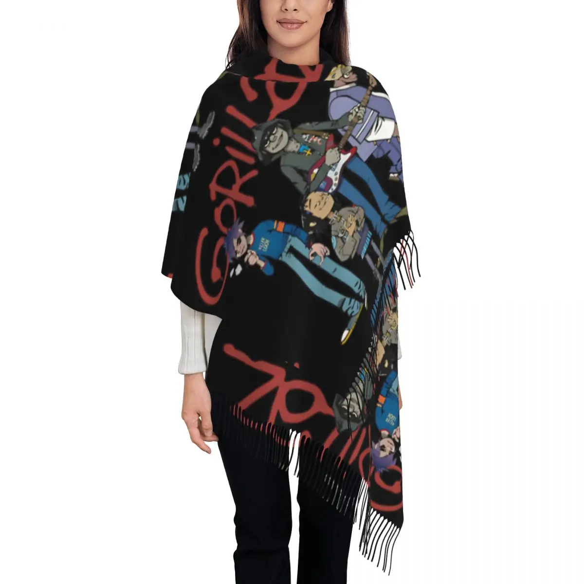 Sciarpa da donna con nappe Musica rock Gorillaz Grande scialle e involucro invernale autunnale Sciarpa in cashmere da indossare ogni giorno vintage Y2K