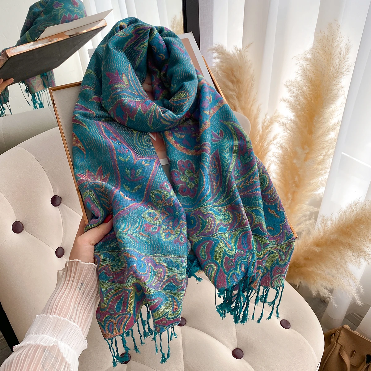 Sciarpa invernale di lusso in cashmere da donna - Scialle con nappe stampato, mantello Pareo ricamato e foulard grosso ed elegante