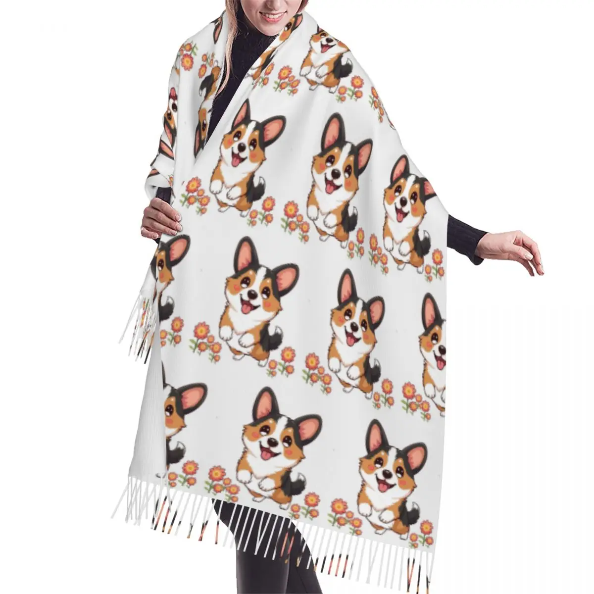 Kawaii Tricolor Corgi nel giardino Sciarpa Sciarpe con nappe Donna Scialli e stole morbidi e caldi Scialle lungo autunno inverno
