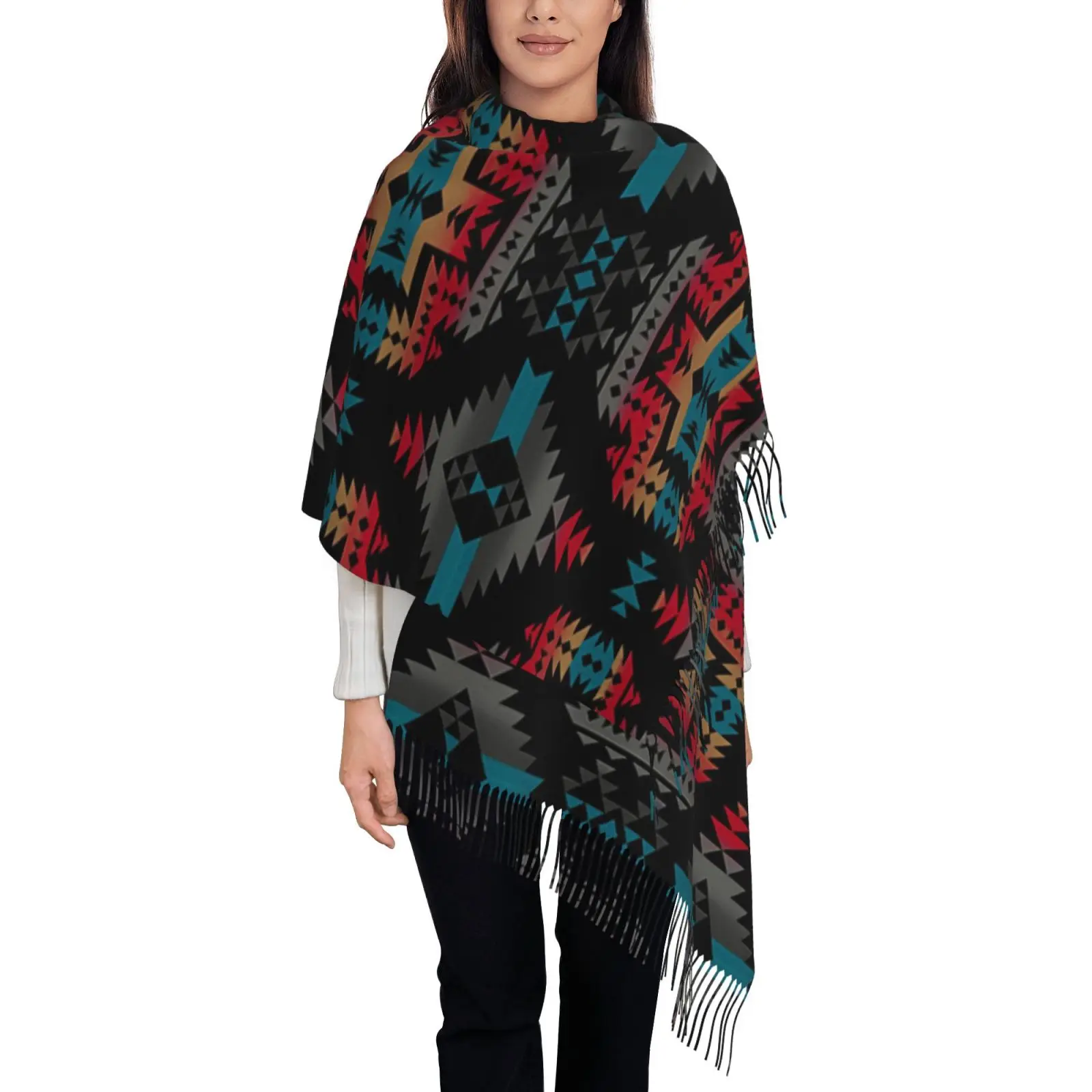 Navajo Stampa Accogliente Sciarpa invernale con nappe Avvolgente con frange oversize per le donne Accessorio da lavoro casual per le vacanze di campeggio in tempo freddo