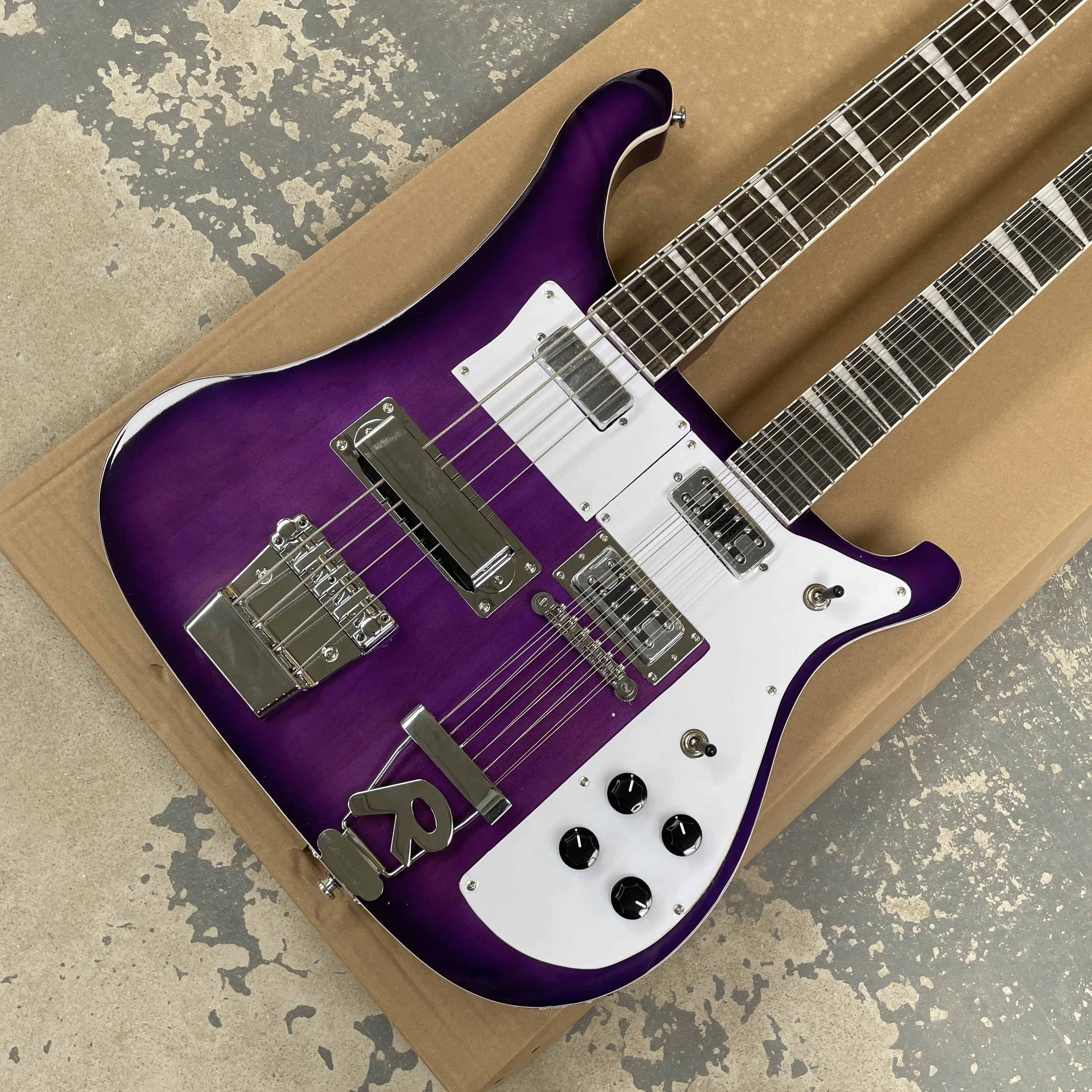 Basso elettrico viola sfumato 4+12, pickguard bianco, sistema tremolo tipo R, chitarra dedicata alle performance sul palco