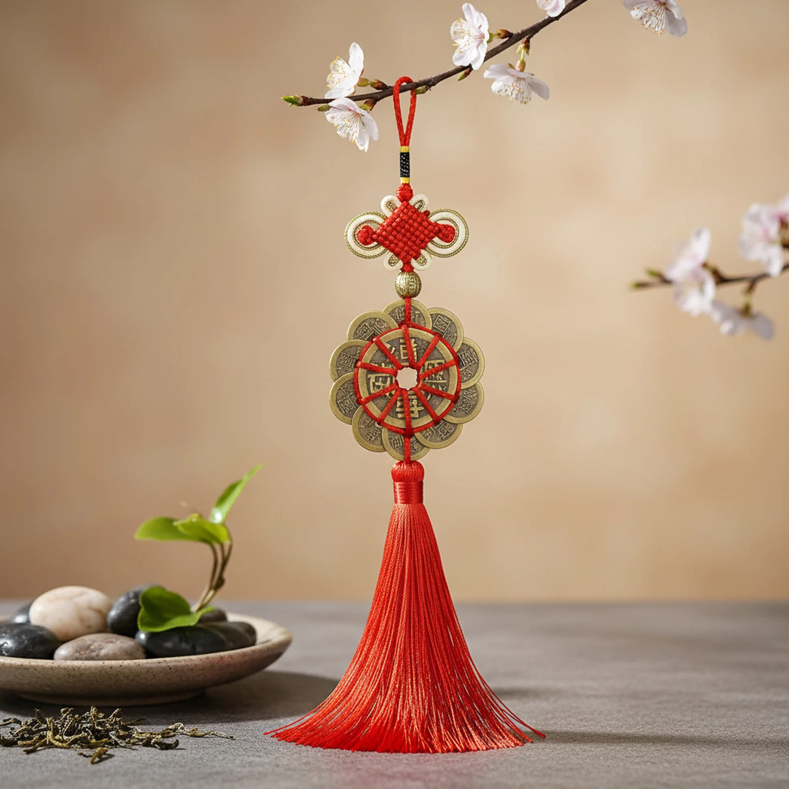 Ciondolo in Rame con Moneta dei Cinque Imperatori e Nodo Auspicoso per Decorazione Auto e Casa