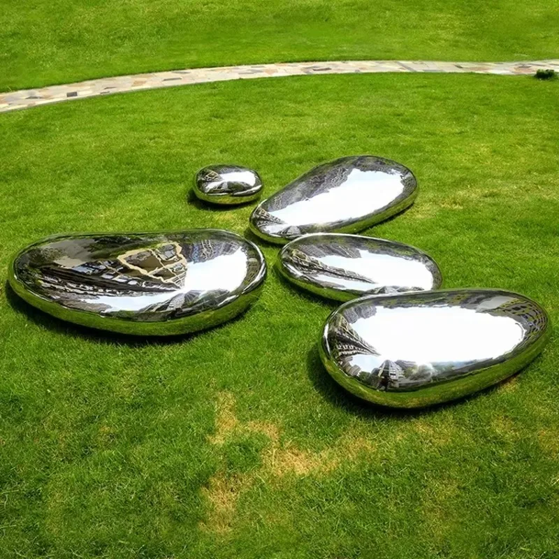 Scultura ellittica in acciaio inossidabile a forma di ciottolo di pietra per lucidatura di specchi da giardino moderni personalizzati per esterni