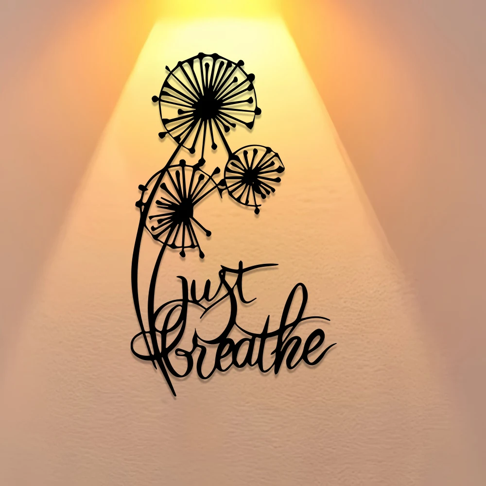 Elegante e minimalista decorazione da parete in metallo, design floreale con tarassaco con citazione ispiratrice 'Just Breathe', arredamento per ufficio, camera da letto