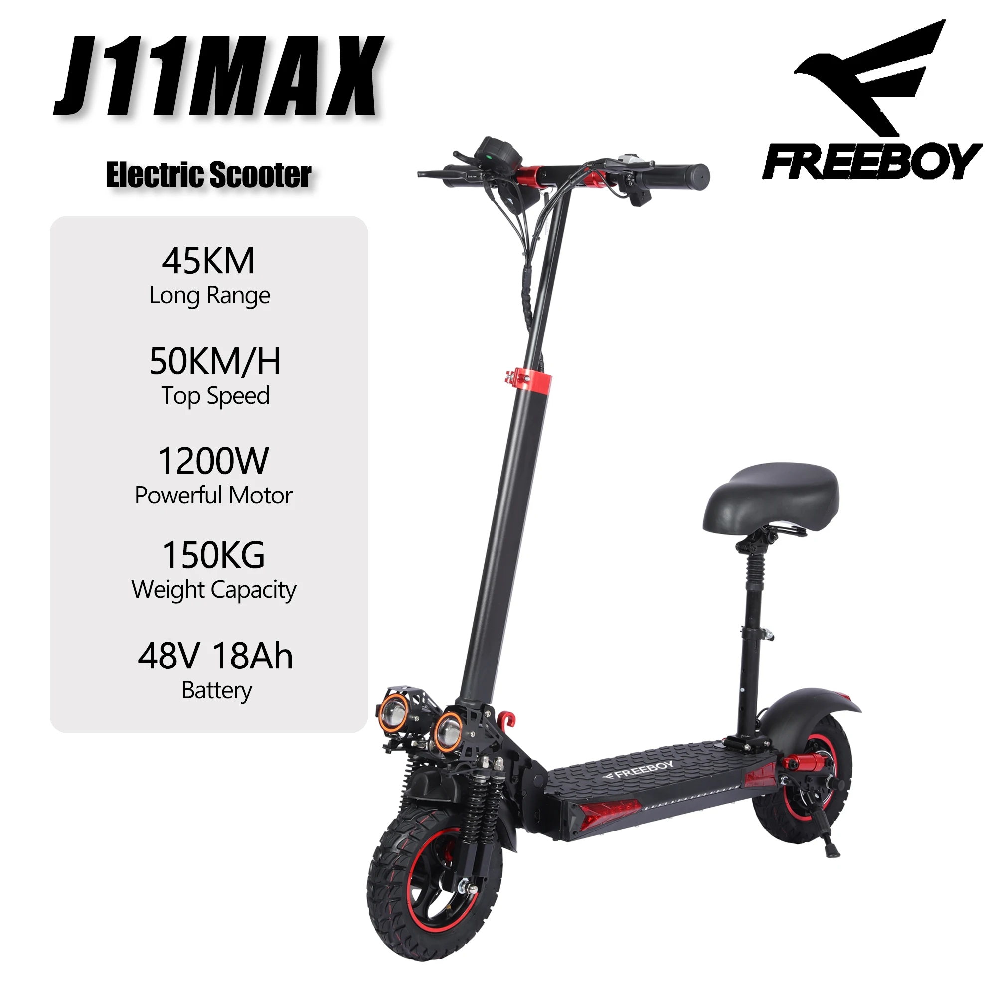Monopattino Elettrico Pieghevole FREEBOY J11MAX, Motore 1200W, 50km/h, Autonomia 45km, Batteria 48V 18AH, Carico Massimo 150kg per Adulti