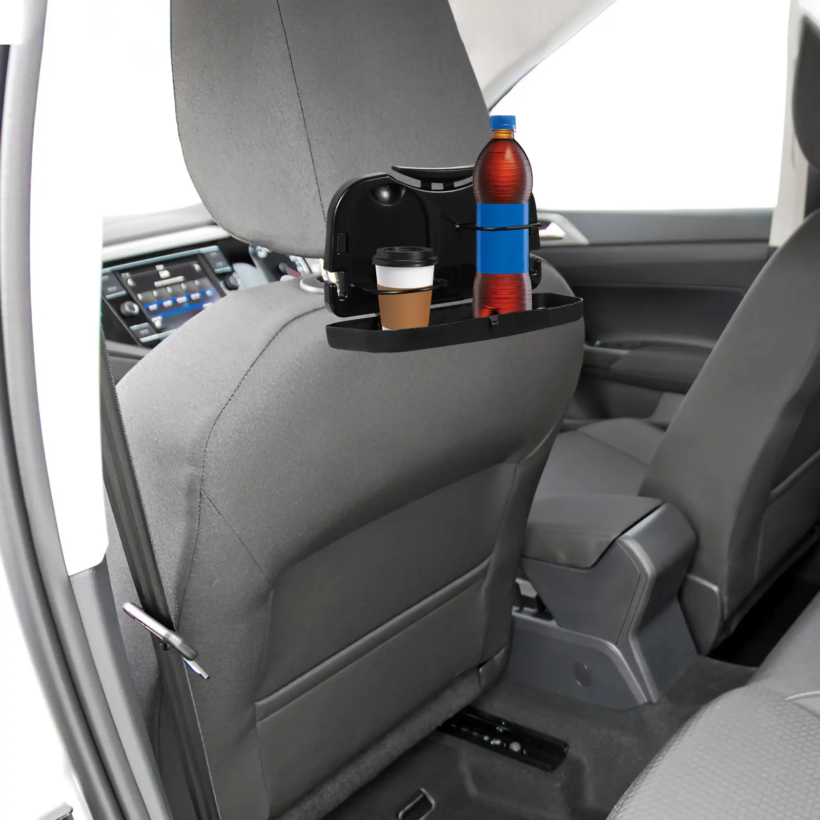 Tavolino Pieghevole per Auto Nero, Organizzatore Multifunzionale per Sedile Posteriore, Portabevande, Portabottiglie e Lattine, Contenitore Pieghevole