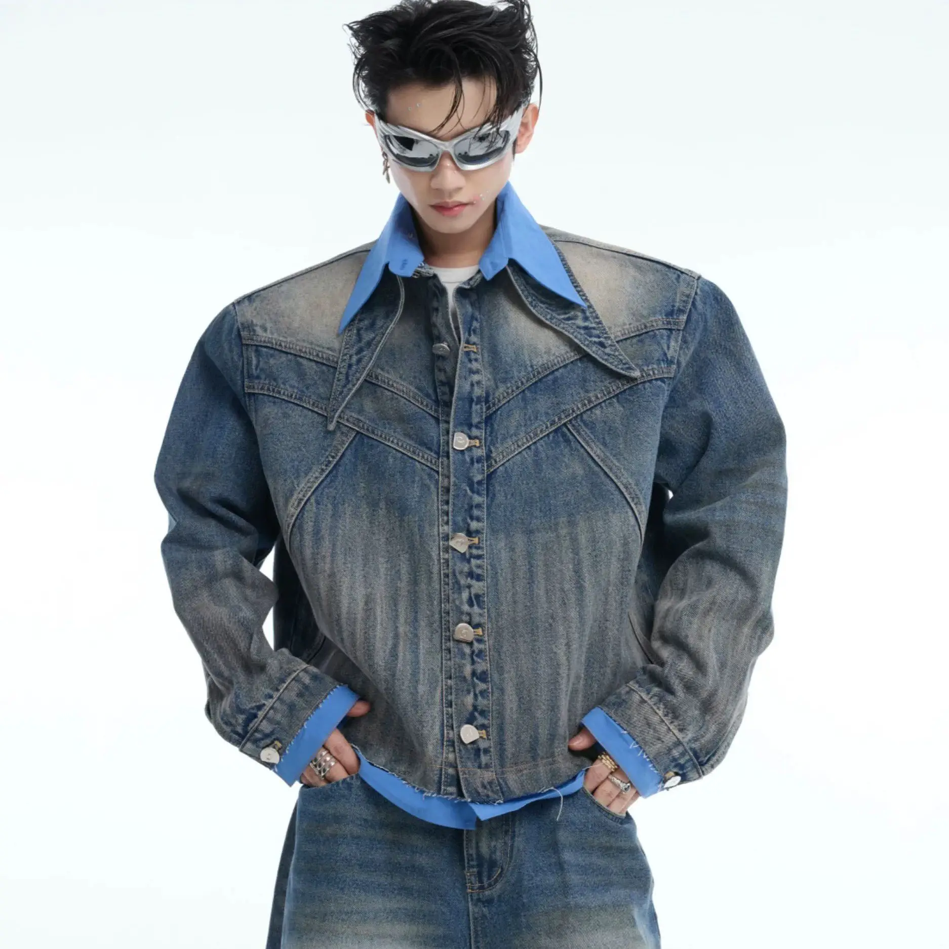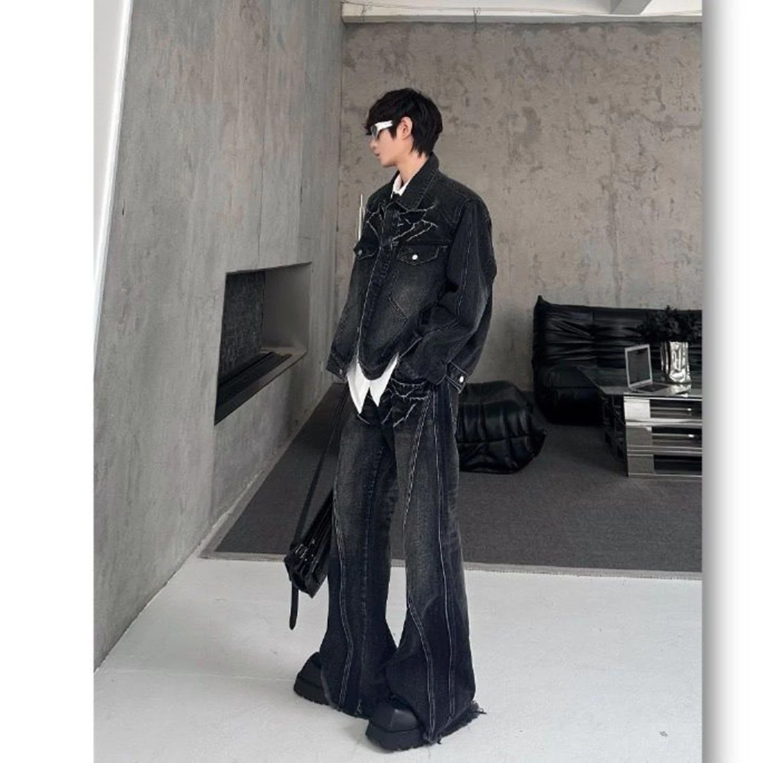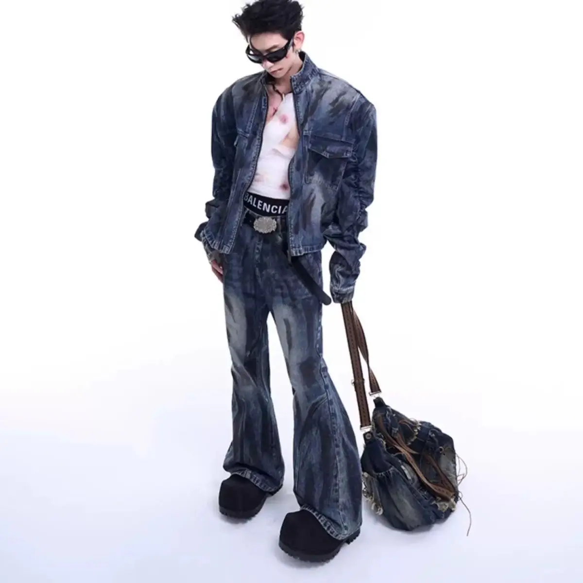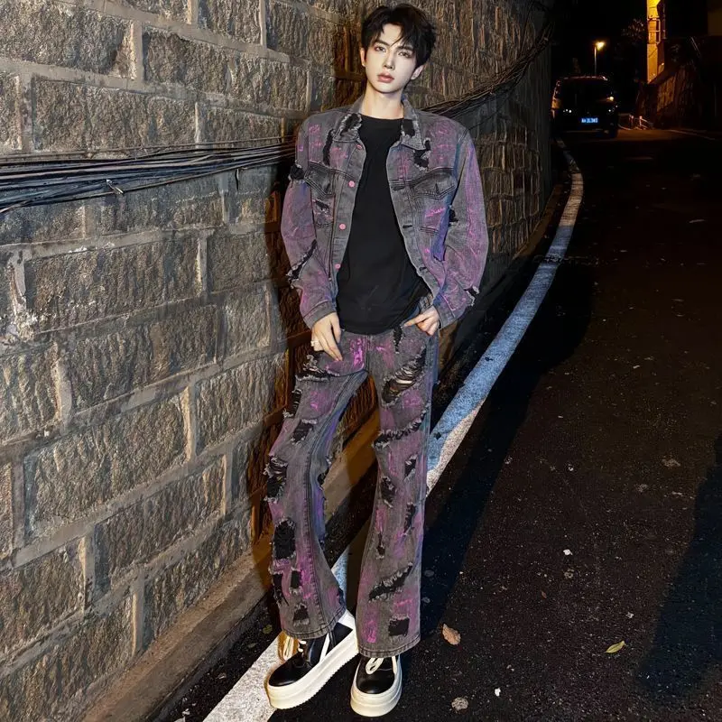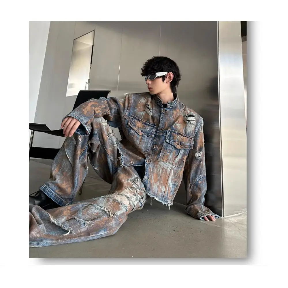 Giacca di jeans vintage sporca stile Wasteland da uomo Pantaloni di jeans micro svasati Set da due pezzi Jeans da giovane ragazzo Cappotto a maniche lunghe da uomo