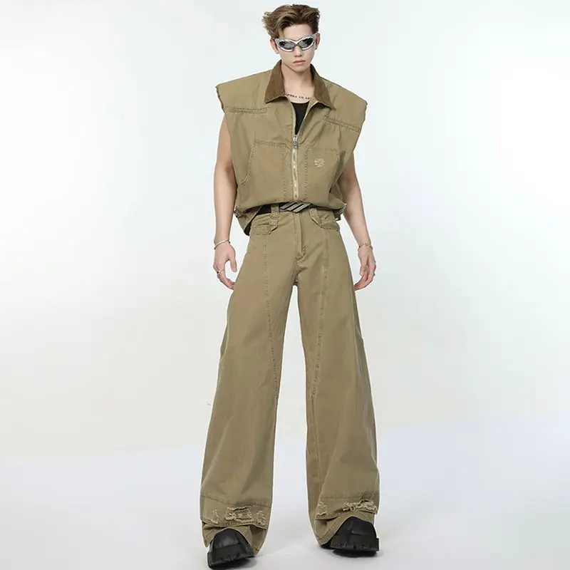 Gilet con cerniera da uomo Abito in denim Casual Street Cool Boy Giacca senza maniche ampia Pantaloni dritti a gamba larga a vita alta da uomo