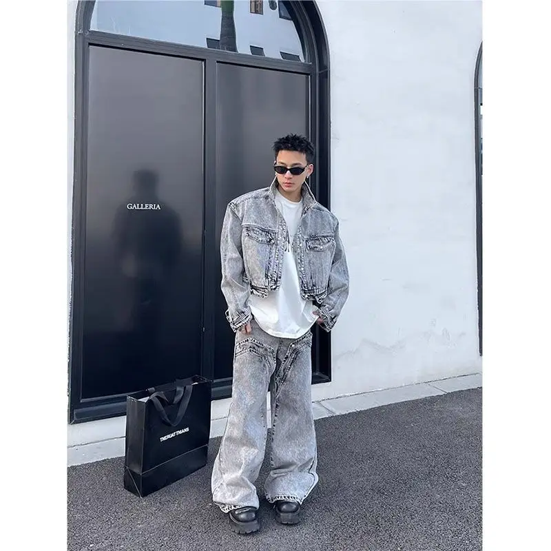Abito da uomo in denim grigio lavato con pietra, casual, da strada, da ragazzo, a maniche lunghe, giacca corta, pantaloni dritti a gamba larga a vita alta
