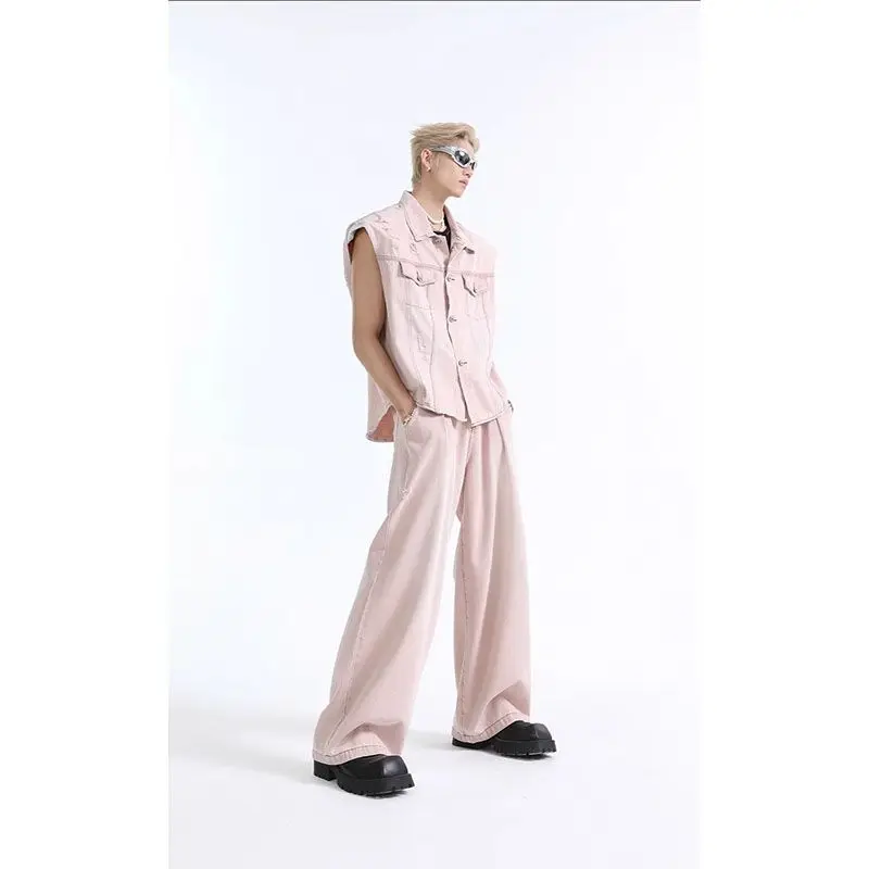 Gilet monopetto da uomo Abito in denim Casual Street Cool Boy Giacca senza maniche ampia Pantaloni dritti a gamba larga a vita alta da uomo