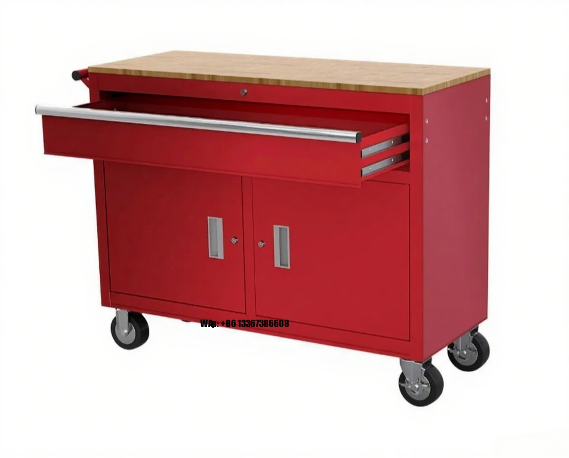 In. Banco da Lavoro Mobile con Piano in Legno Massello e Armadietto Portautensili Rosso
