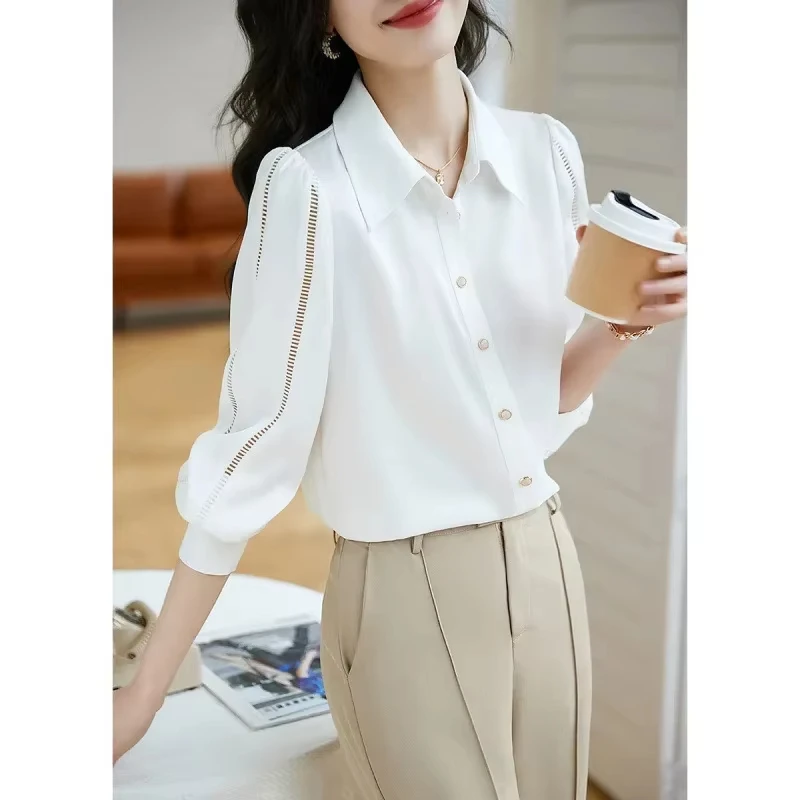 Americano Europeo New Fashion 2025 Colletto rovesciato da donna Manica lunga Tinta unita Casual Trendy Camicie a petto allentato Donna