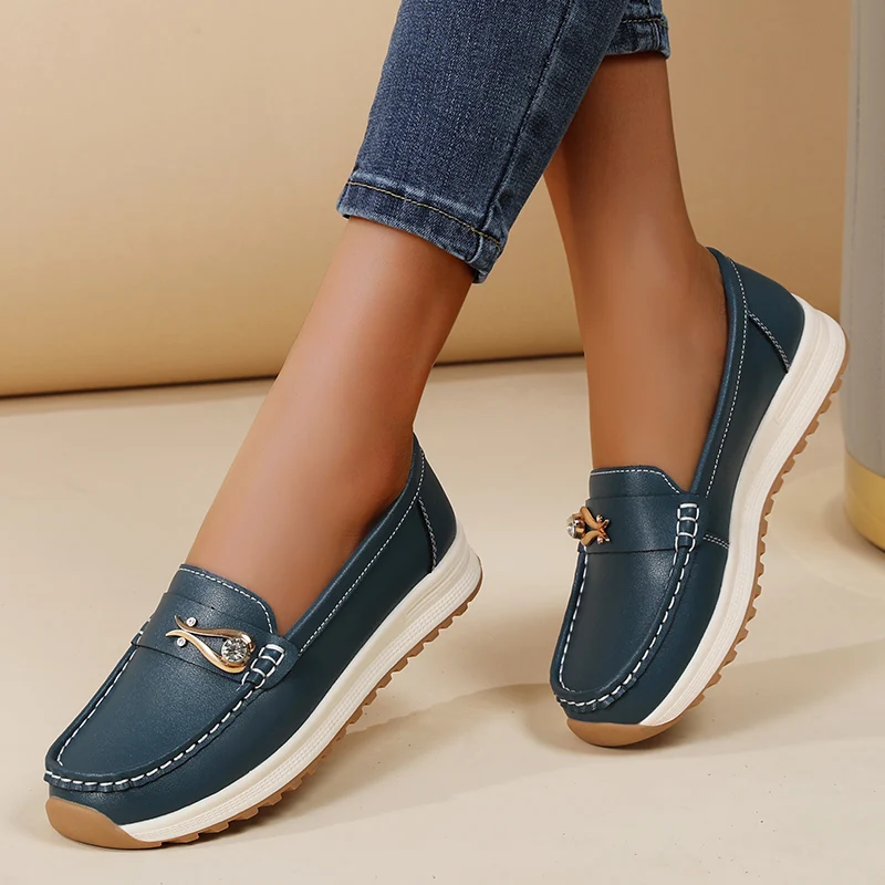 2026 Nuovi mocassini con plateau Four Seasons da donna, SlipOnSoftSoleLeatherShoeswithMetalBuckleDecorations, ShallowCutVersatileFlat