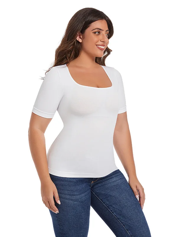 Maglietta Modellante Senza Cuciture Plus Size con Controllo Pancia, Camicia Modellante Elasticizzata a Maniche Corte, Blusa Tinta Unita