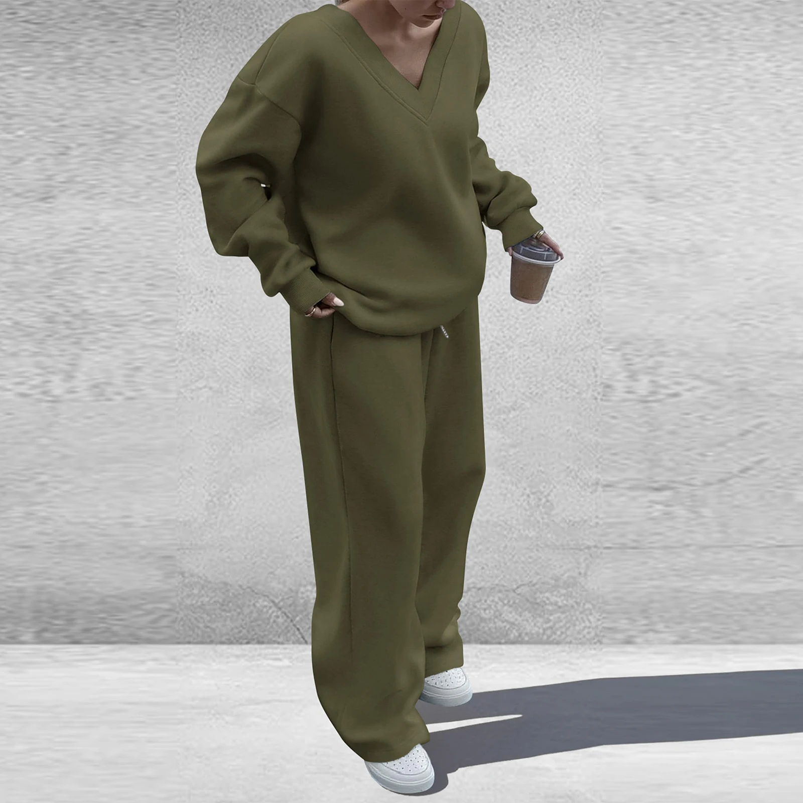 Completo da donna alla moda due pezzi: felpa a maniche lunghe con scollo a V e pantaloni a gamba larga, vestibilità comoda e trendy per il tempo libero e l'attività.