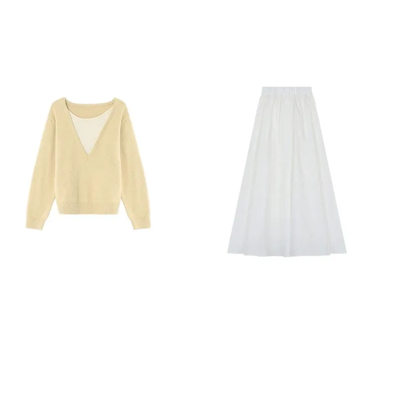 Maglione Giallo Morbido e Femminile, Look Stratificato, Top in Maglia a Maniche Lunghe, Set Due Pezzi Casual con Gonna Bianca