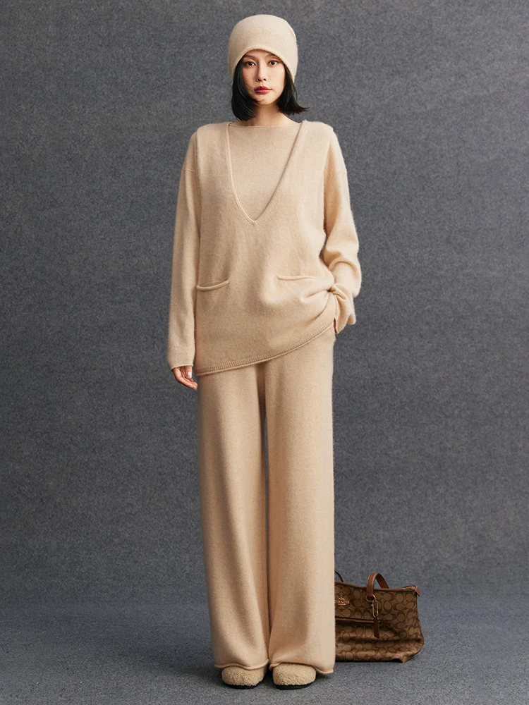 TLOML Set da Donna 100% Cashmere: Maglione Girocollo, Gilet con Tasche a V, Pantaloni a Gamba Larga - Completo Casual in Maglia di Cashmere Autunno Inverno