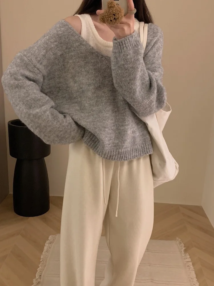 Maglione Lussuoso Stile Coreano, Super Morbido in Misto Cashmere, Scollo a V, Pullover Termico, Set Due Pezzi, Maglieria Calda e Spessa