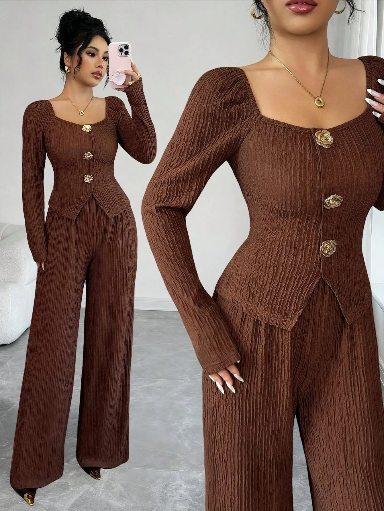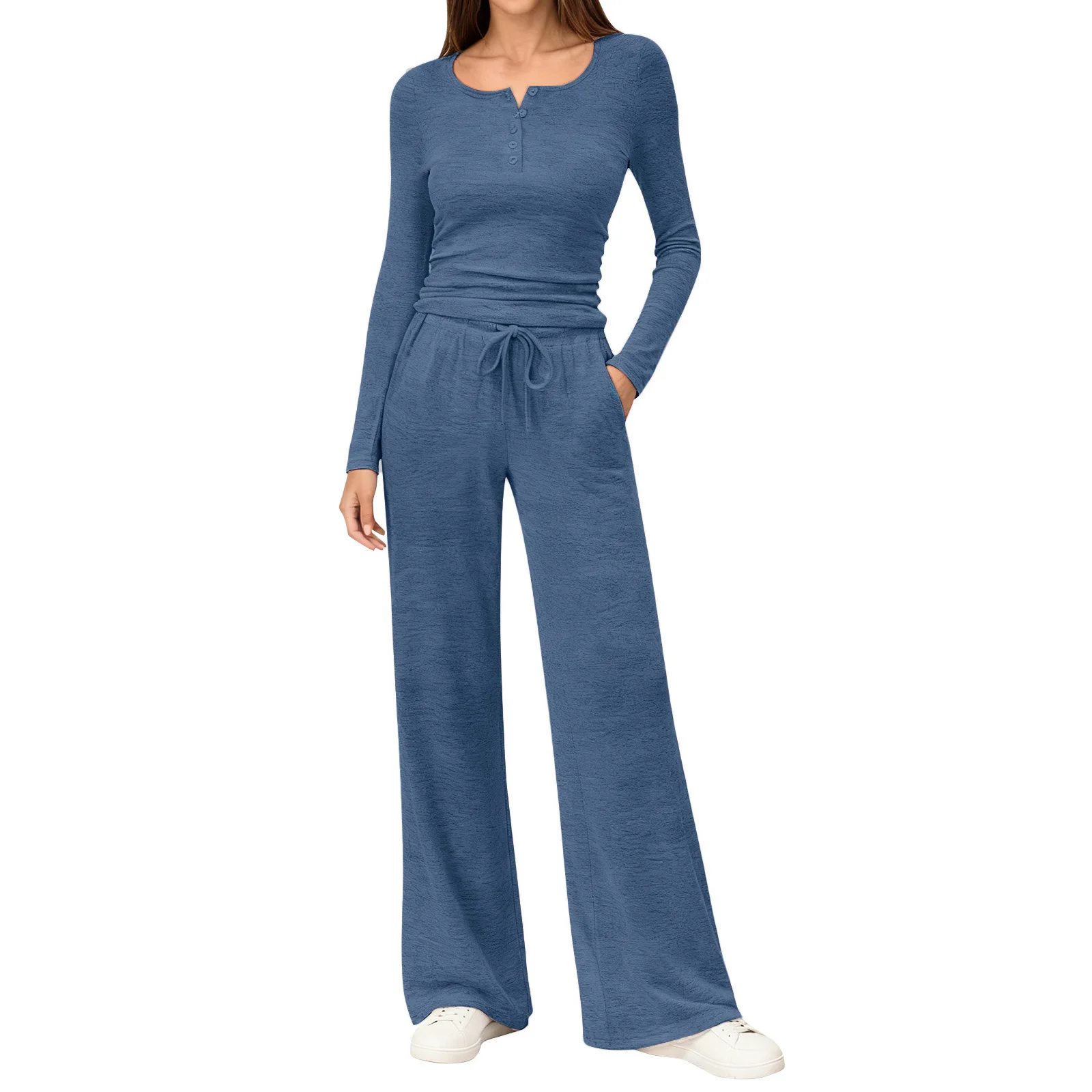 Set Due Pezzi Casual da Donna alla Moda, Top Lavorato a Maglia con Bottoni a Maniche Lunghe, Pantaloni a Gamba Larga, Outfit Chic e Comodo per l'Autunno