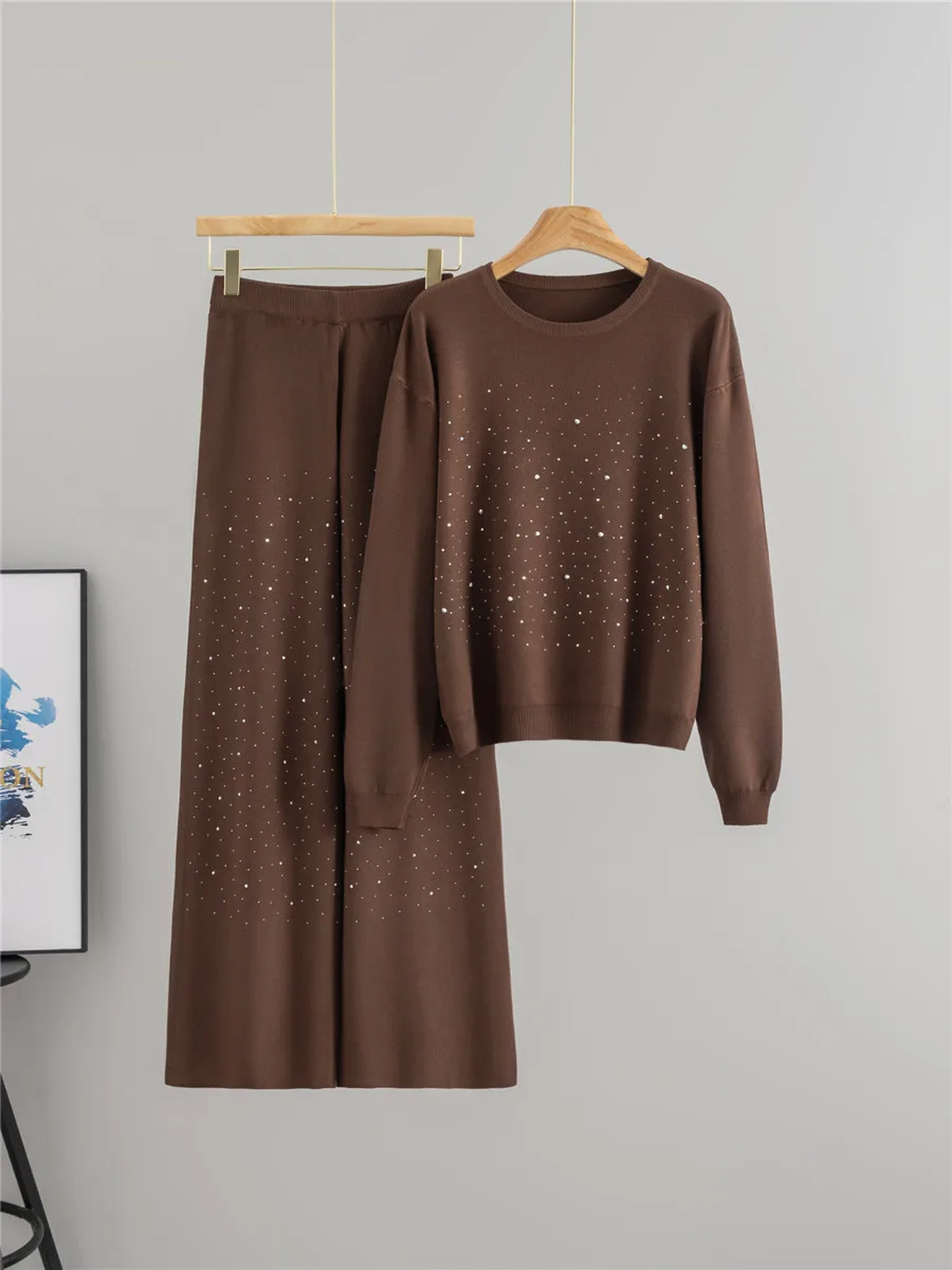 Elegante Completo in Maglia con Strass, Maglione Ampio a Collo Tondo, Set Lavorato a Maglia Scintillante, Maglione Casual a Maniche Lunghe