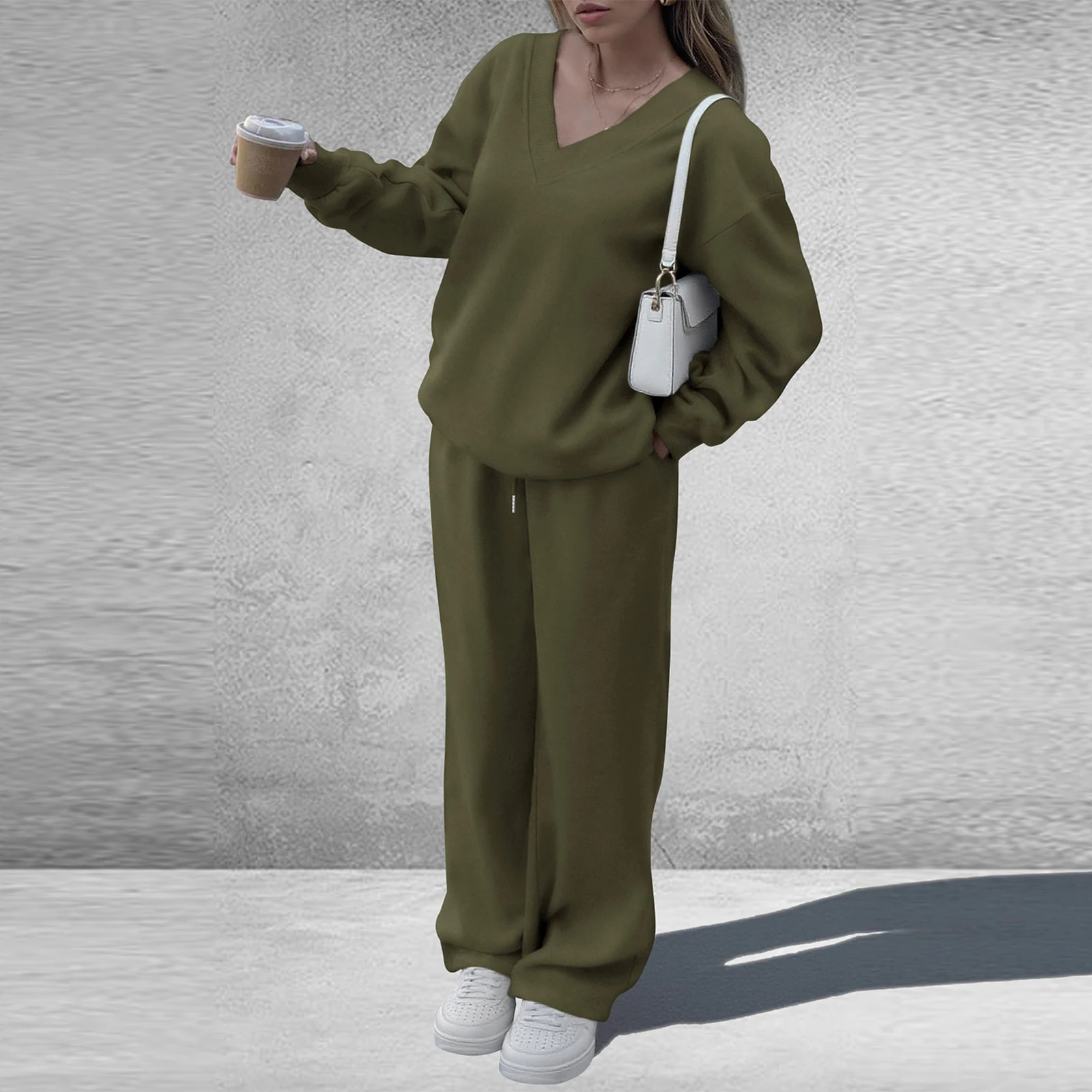 Completo da donna alla moda due pezzi: felpa a maniche lunghe con scollo a V e pantaloni a gamba larga, vestibilità comoda e trendy per il tempo libero e l'attività.