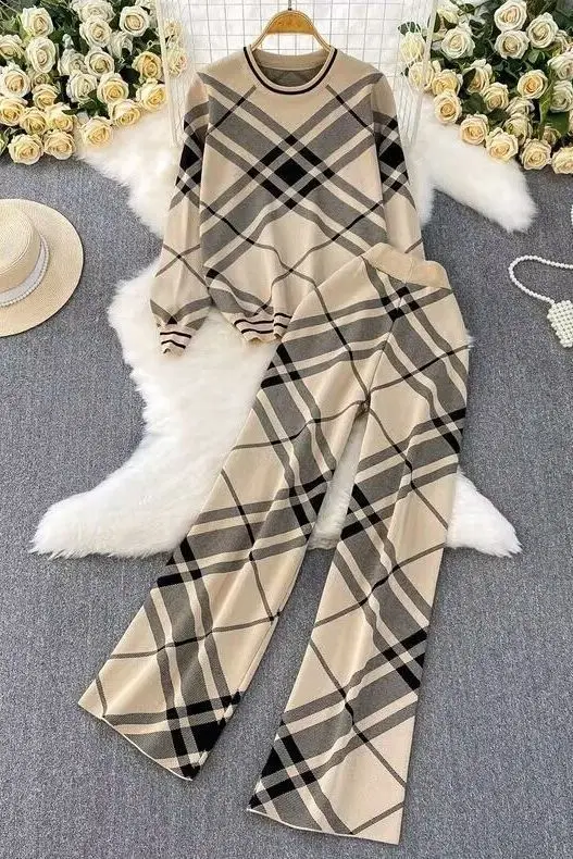 Completo Due Pezzi Europeo a Vita Alta, Set Due Pezzi Largo Stampato a Quadri in Maglia, Elegante Completo Casual da Ufficio