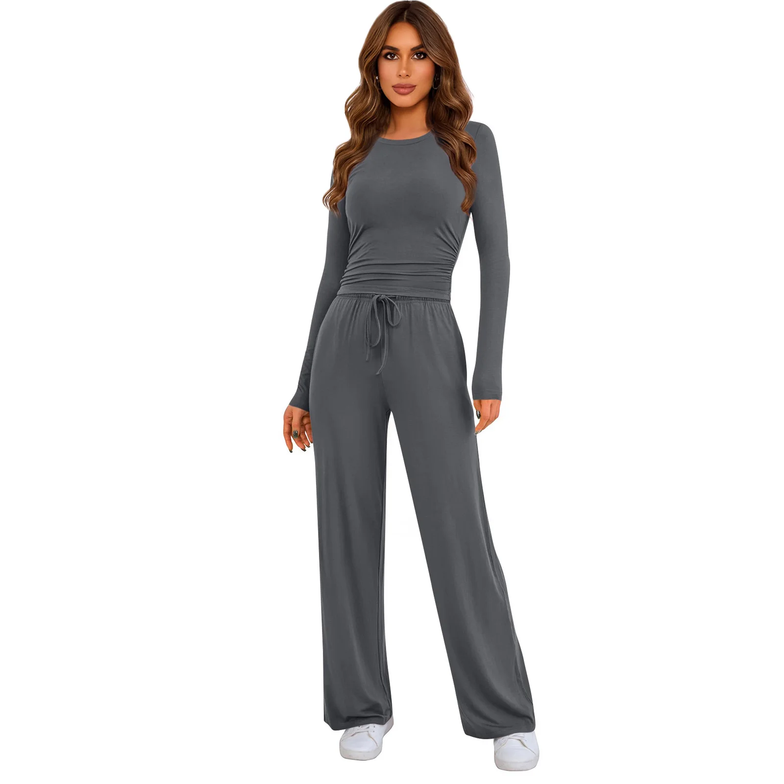 Completo Casual da Donna Due Pezzi: Top a Maniche Lunghe con Arricciatura e Pantaloni a Gamba Larga, Outfit Comodo e Rilassante per l'Autunno