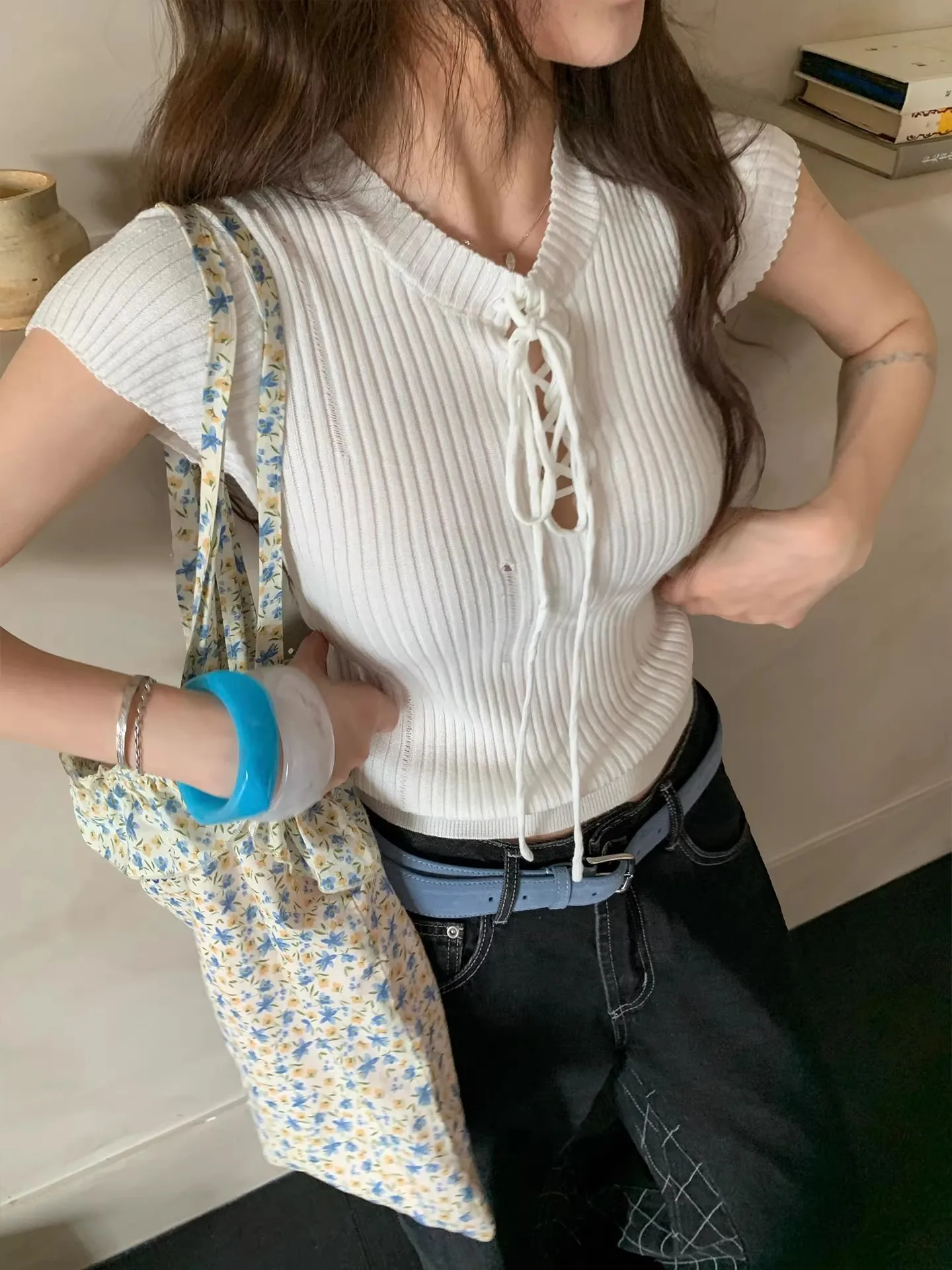 Nuova T-shirt Estiva da Donna 2026 in Stile Coreano, Bianca, con Lacci, in Maglia a Maniche Corte, Vestibilità Slim, Design Carino
