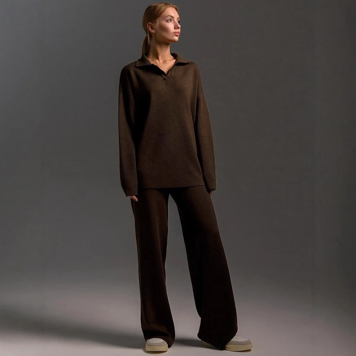Completo Sofisticato ClassicPolo a Coste con Maniche Lunghe, Tuta Termica Ultra-Morbida, Outfit Casual Trendy per Signore