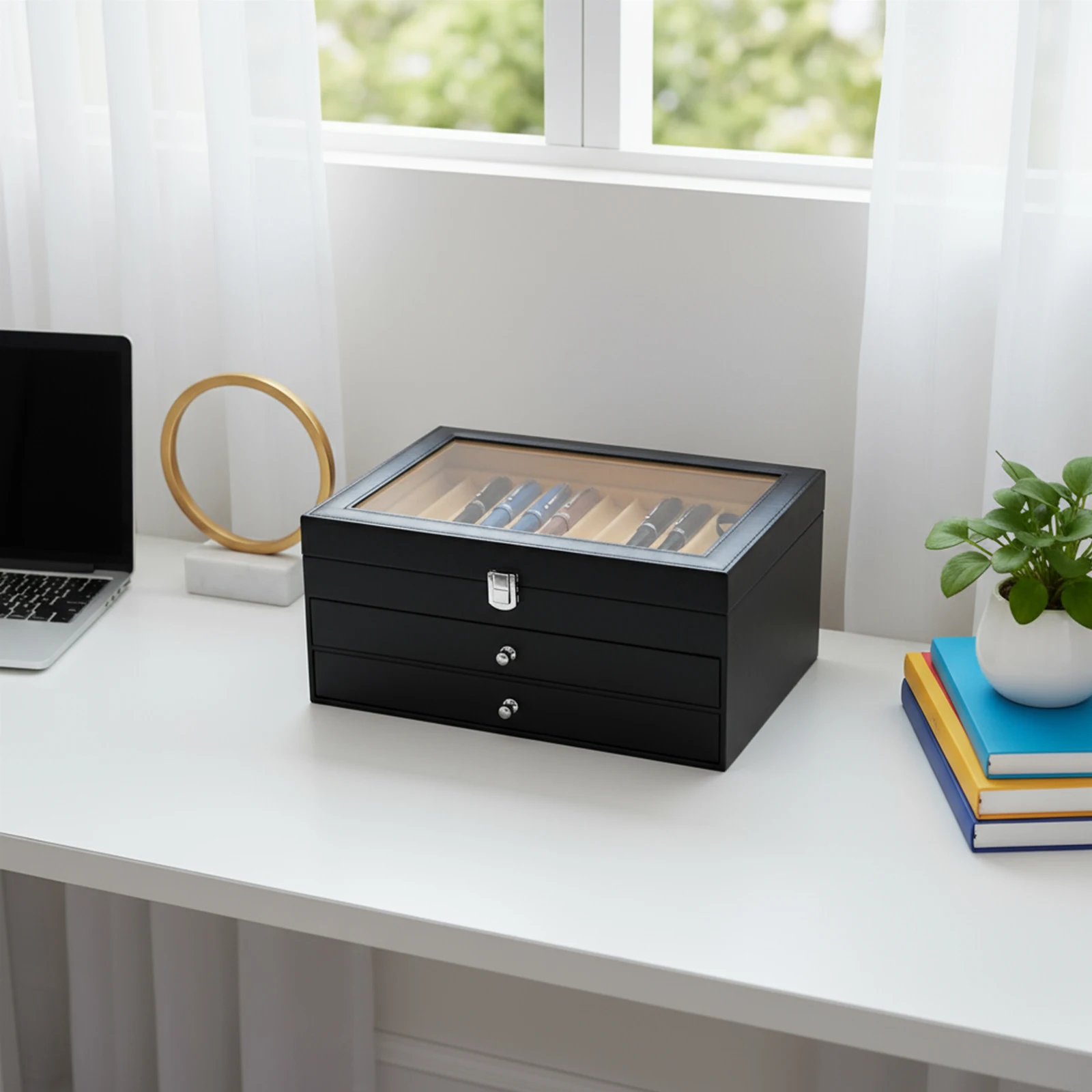 Vetrina per penne a 3 livelli Scatola per penne in pelle a 36 slot Organizzatore per penne in pelle PU vintage Portaoggetti da scrivania nero | Stazione portapenne