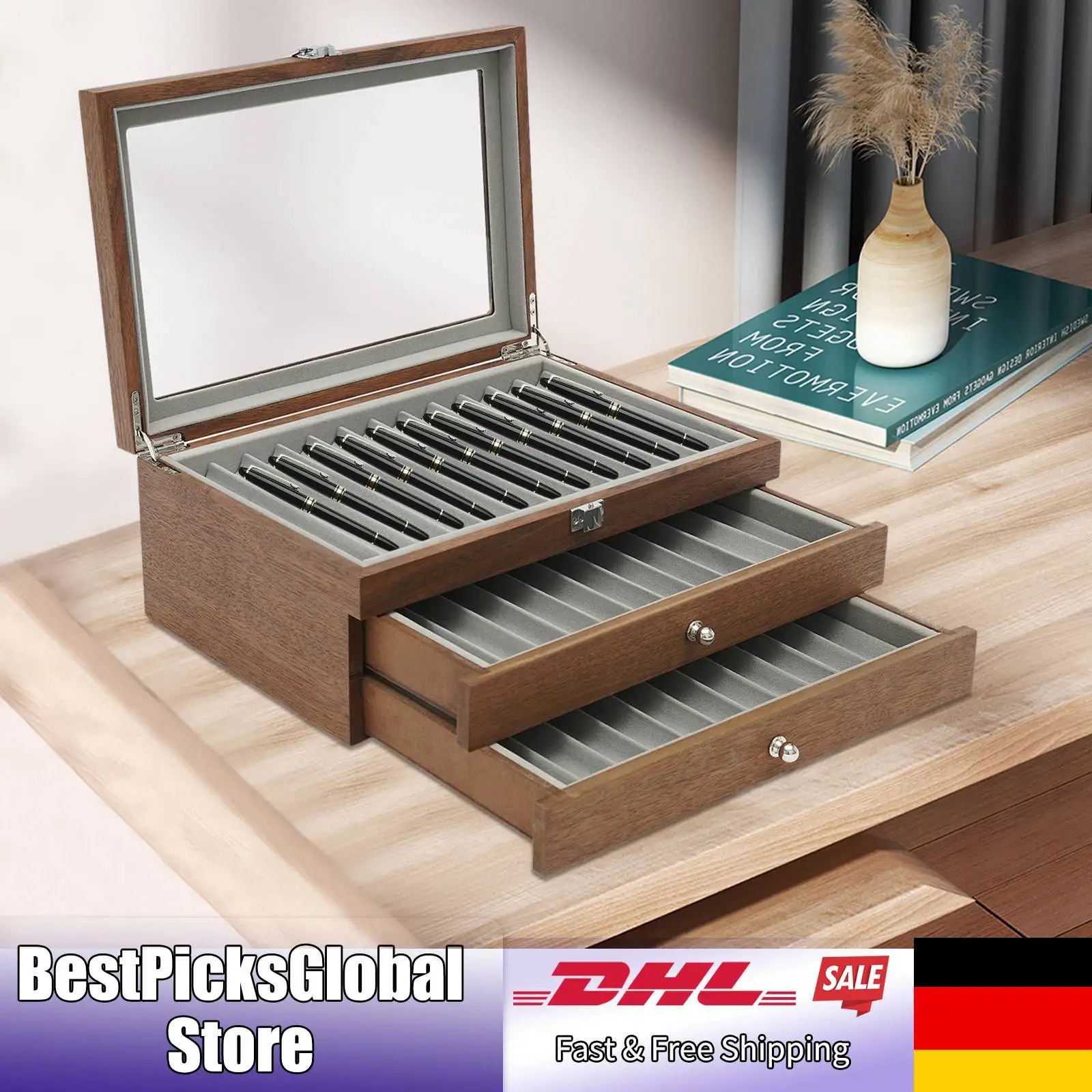 Scatola per penne in legno, organizer per esposizione di stoccaggio a 3 strati e 34 slot, supporto per esposizione penna stilografica rossa, regalo per l'home office, custodia da collezione