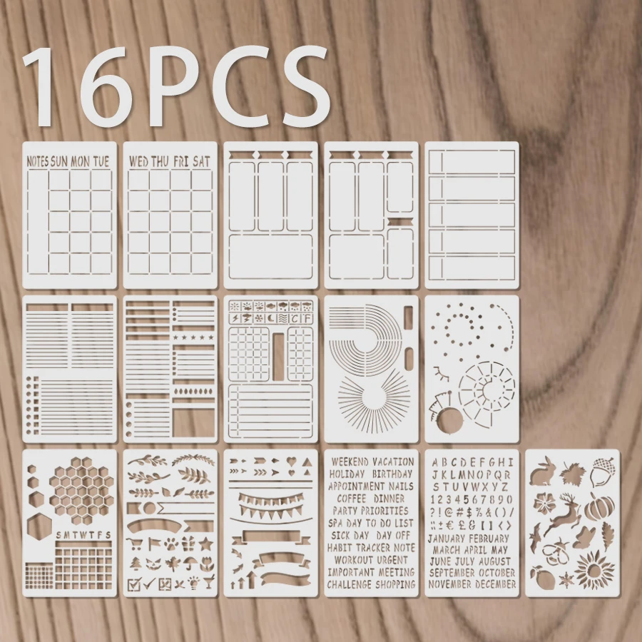 Set di 16 Stencil A5 per Diario, 7,4 x 4,9 Pollici, Modelli per Planner, Stencil per Disegno e Design Fai-da-Te per Quaderni