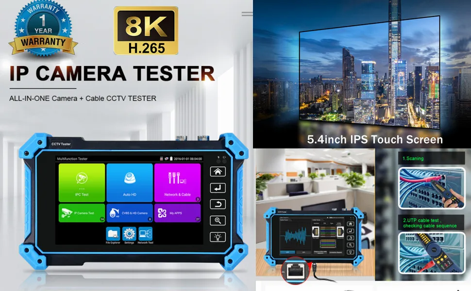 5.4 "8K CCTV IPC Tester IPC5200 Strumento di test della telecamera 8MP AHD CVI TVI Tester per telecamera VGA HDMI PTZ PoE UTP Tester per cavi di rete CCTV