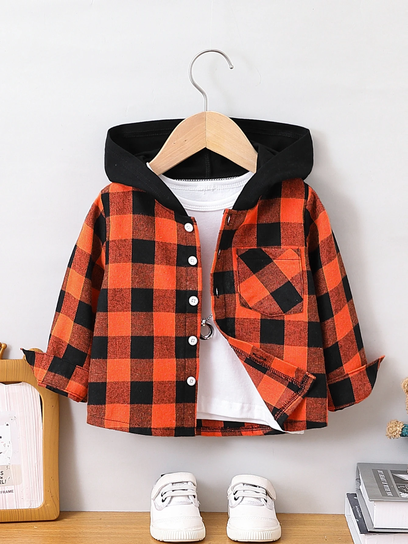 Camicia scozzese arancione e nera per bambini, casual, stile vintage, abbottonata, vestibilità ampia, comoda e versatile, pezzo unico