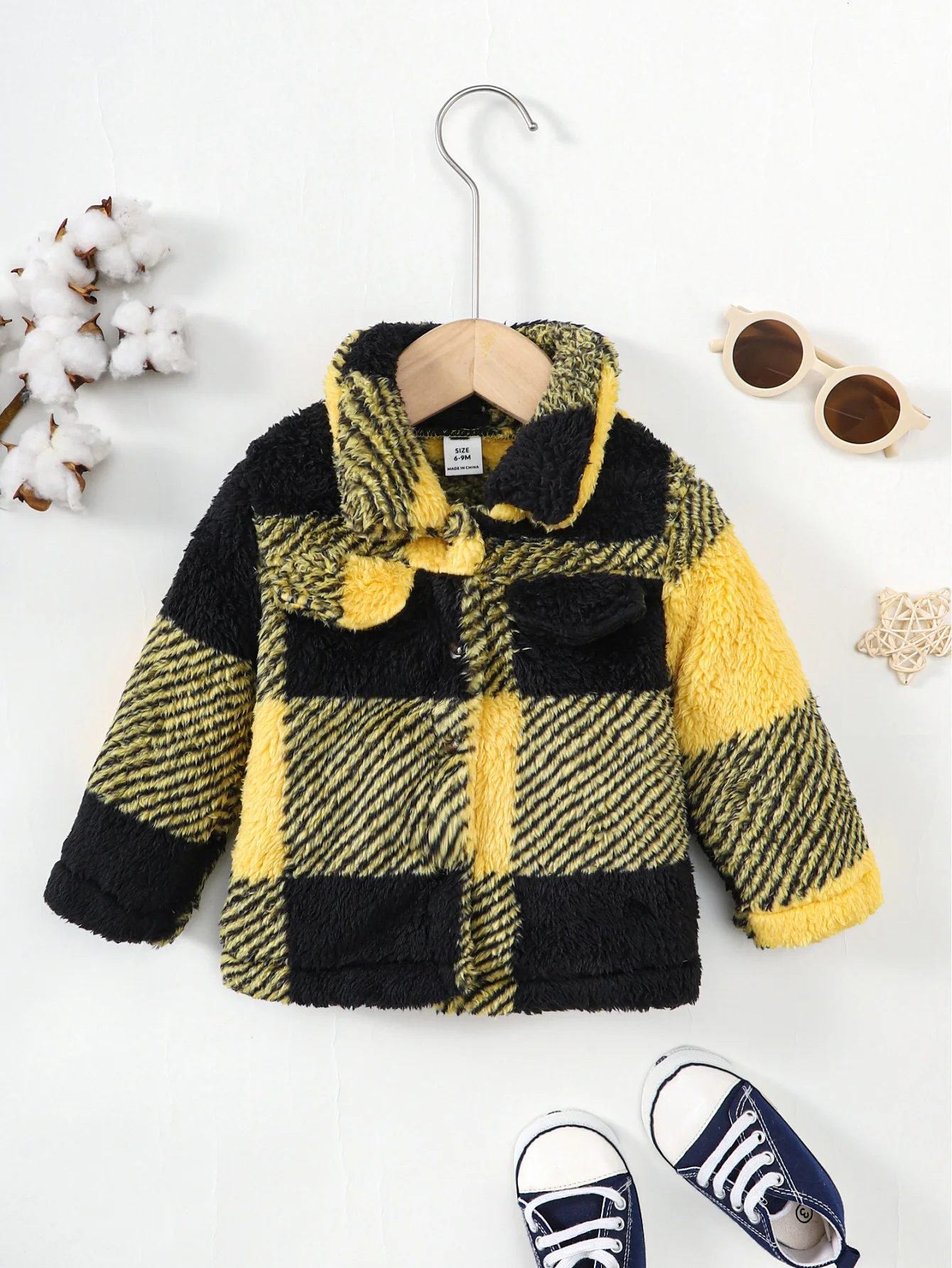 Caldo cappotto in peluche per bambini, giacca abbottonata in pile a quadretti nero e giallo, comodo e caldo, adatto per uscire.