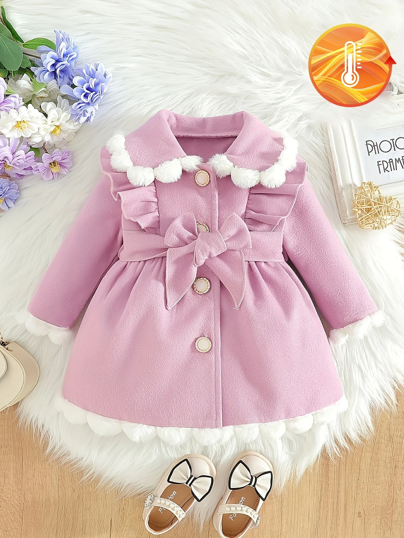 Cappotto con bordi in peluche con fiocco viola chiaro per bambina, regalo di San Valentino/compleanno, abito da esterno delicato e accattivante