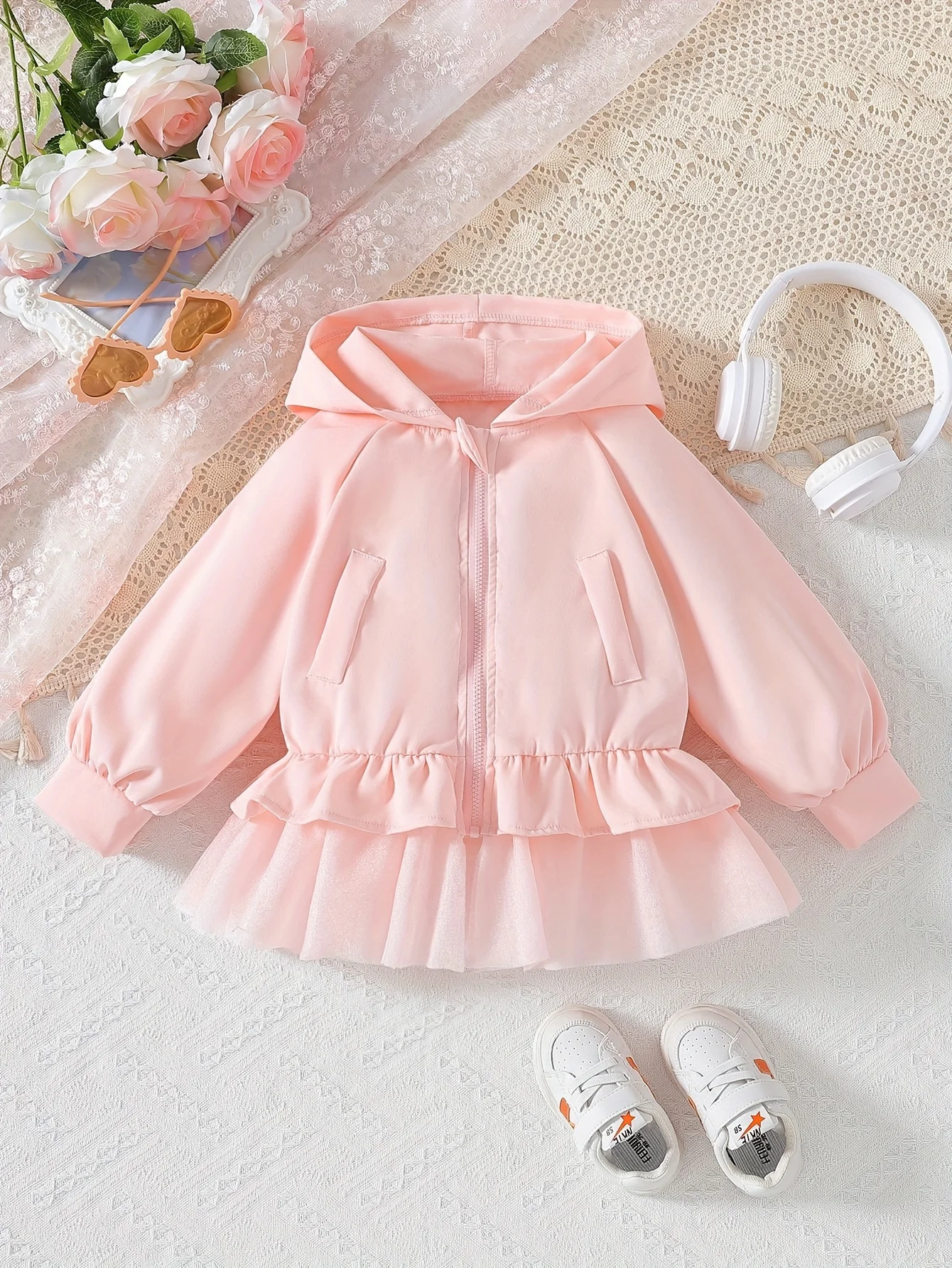 Abito con cappuccio primavera-autunno per bambina: tasche finte e gonna trasparente, per divertimento all'aria aperta, perfetto per compleanni e regali di San Valentino