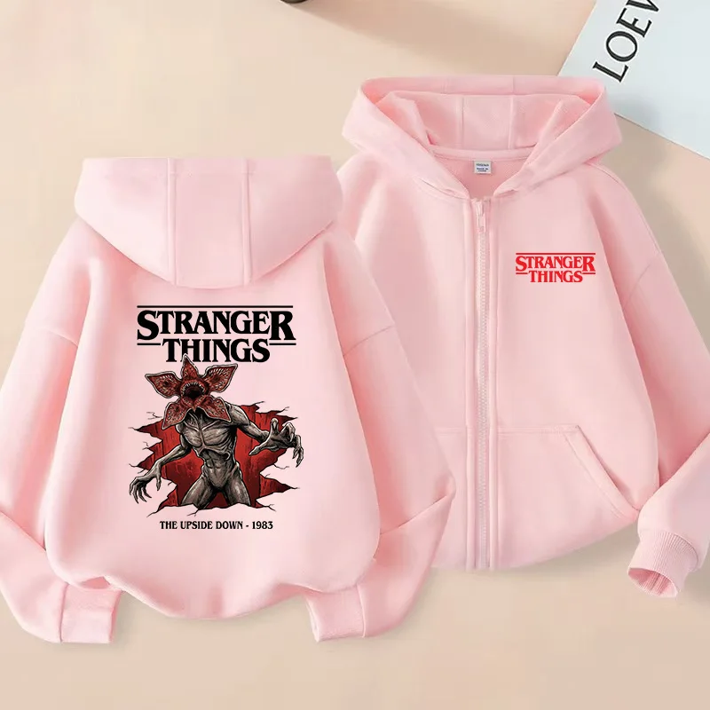2025 Cartoon Girls Boy Hawkins Demogorgon Zip Felpa con cappuccio Moda per bambini Casual Top WILL Abbigliamento per ragazze Felpe con cappuccio