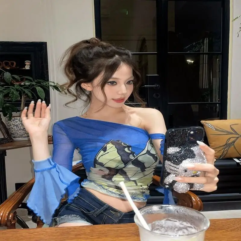 Maglietta Sexy Kawaii da Donna, Pullover alla Moda con Stampa Cartoon, Casual con Nastro, Traspirante, in Pizzo, ad Asciugatura Rapida, Top in Rete, Abbigliamento Femminile