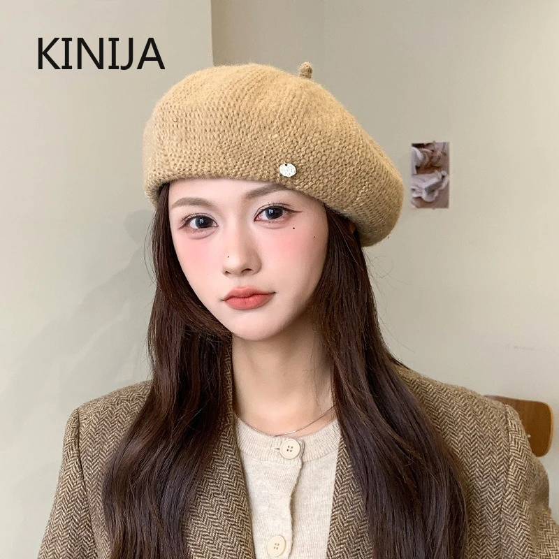 Autunno e inverno nuovo cappello da pittore di lana alla moda coreana versatile berretto giapponese in tinta unita per donna